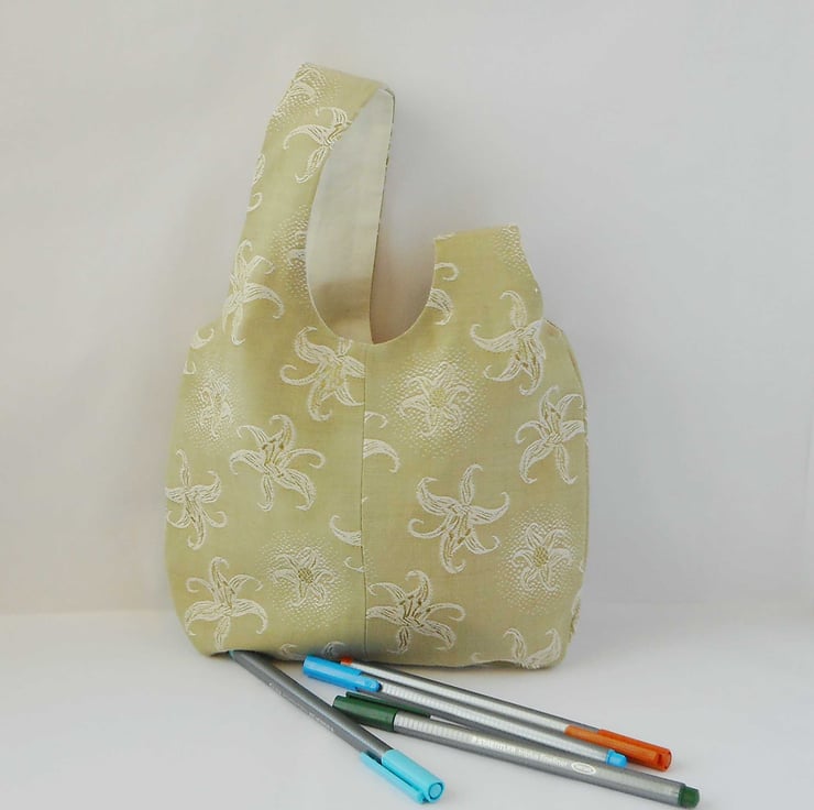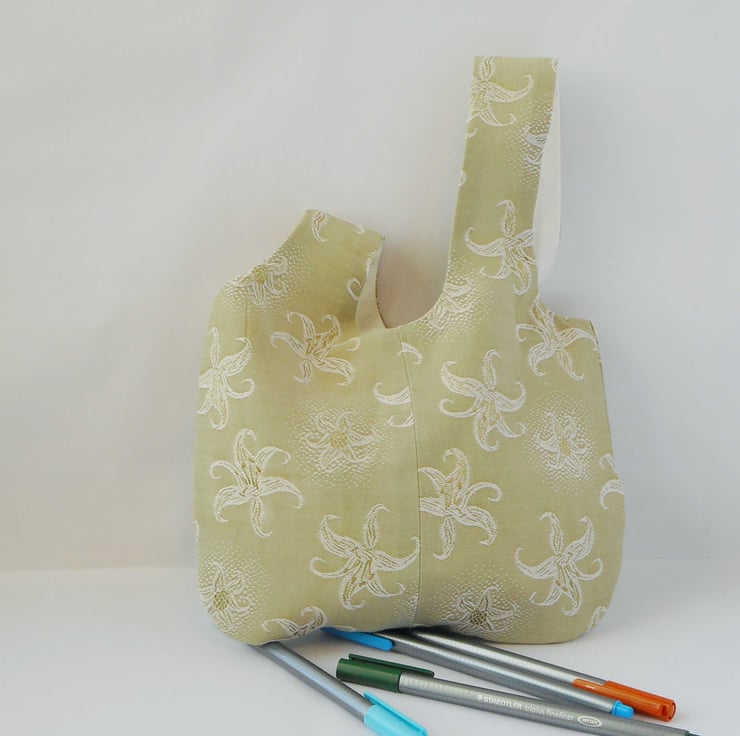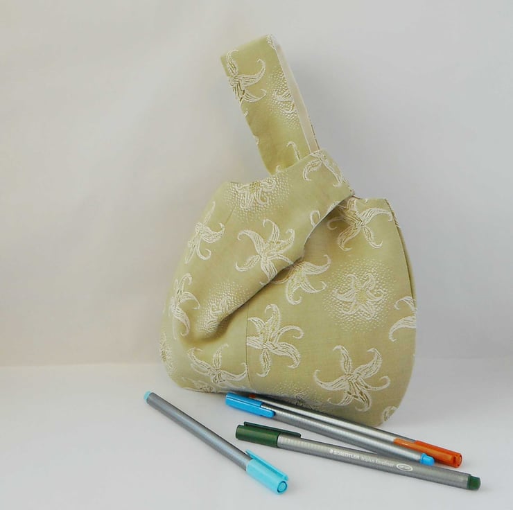 Vintage fabric japanese knot bag in a soft mossy green with a jacquard woven in lily design. Fibre content unknown - it's soft and floppy.