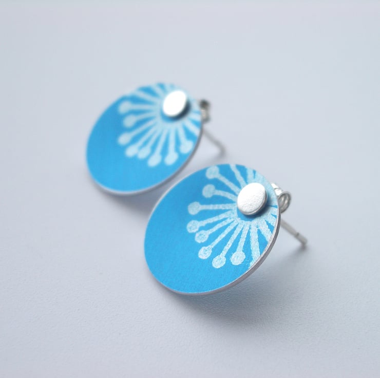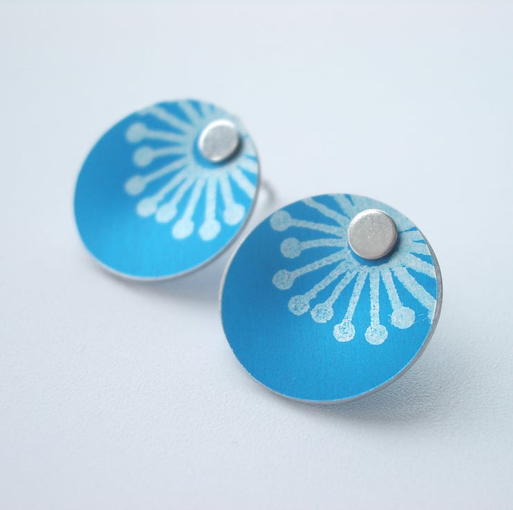 These bright starburst circle studs are made from aluminium which I have dyed a bright blue and printed with a silver starburst design. I seal in the dye so that it becomes a permanent part of the metal and saw pierce the disc shape by hand, filing and smoothing the edges to give a nice finish. Finally I've drilled holes for the sterling silver studs to feed through and domed the discs inwards so that they catch the light. It's not possible to solder