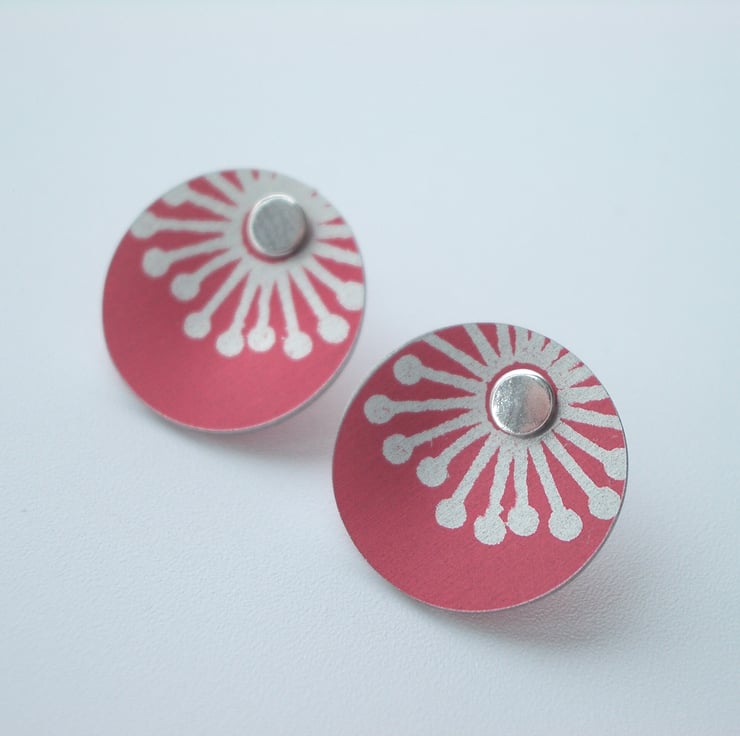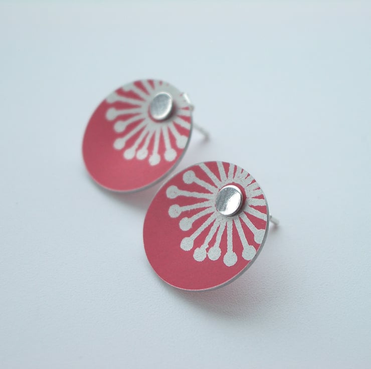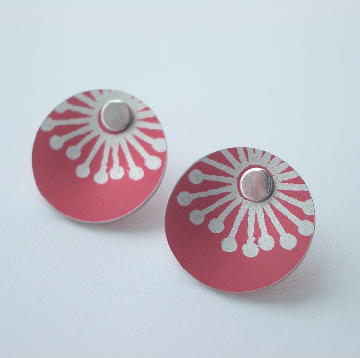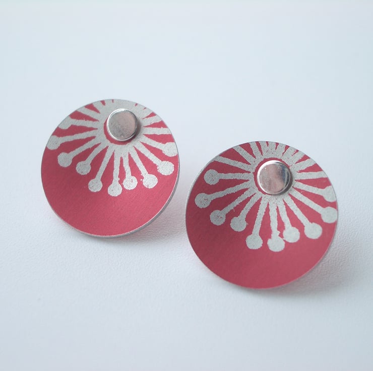 These sweet little studs are made from aluminium which I have dyed red and printed with a starburst design. I seal in the dye so that it becomes a permanent part of the metal and saw pierce the disc shape by hand, filing and smoothing the edges to give a nice finish. Finally I've drilled holes for the sterling silver studs to feed through and domed the discs inwards so that they catch the light. It's not possible to solder