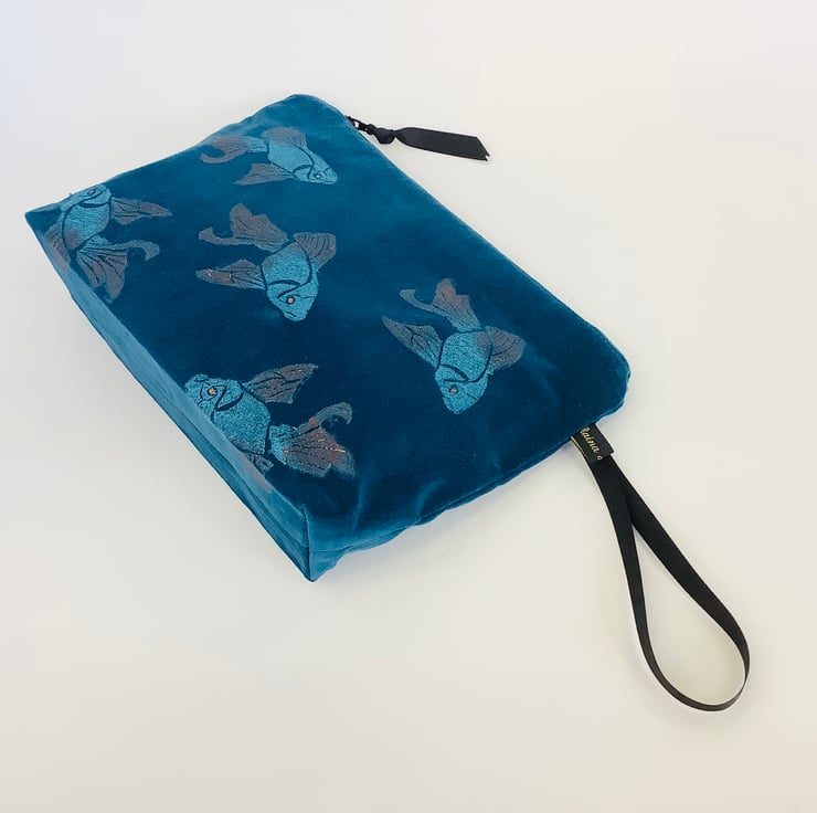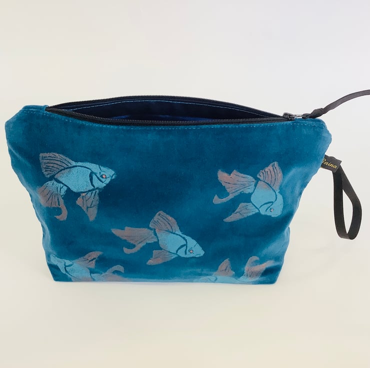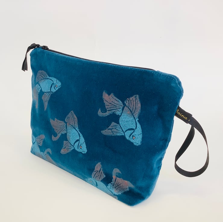 Introducing the Teal Koi Fish Velvet Makeup Bag, an exquisite addition your daily makeup routine and unique art accessory.