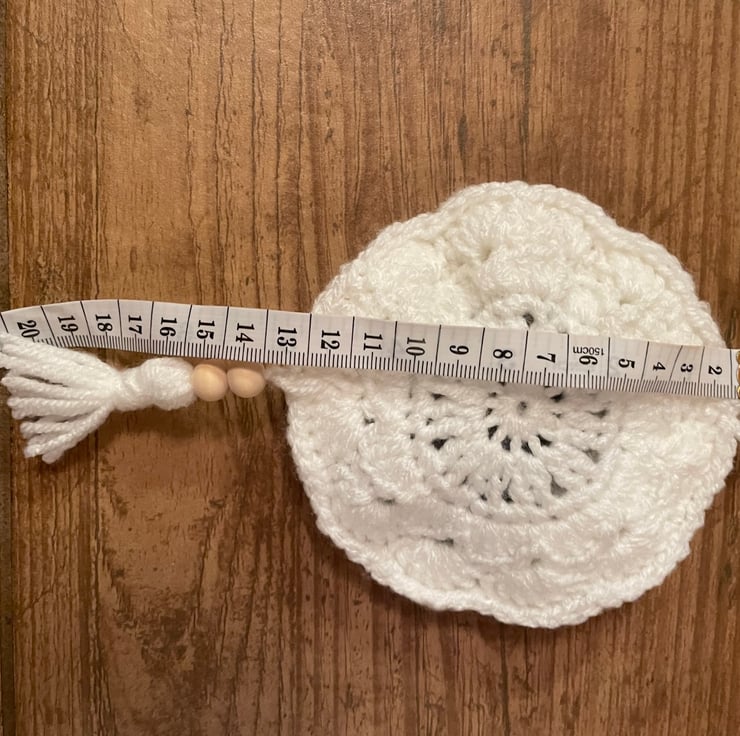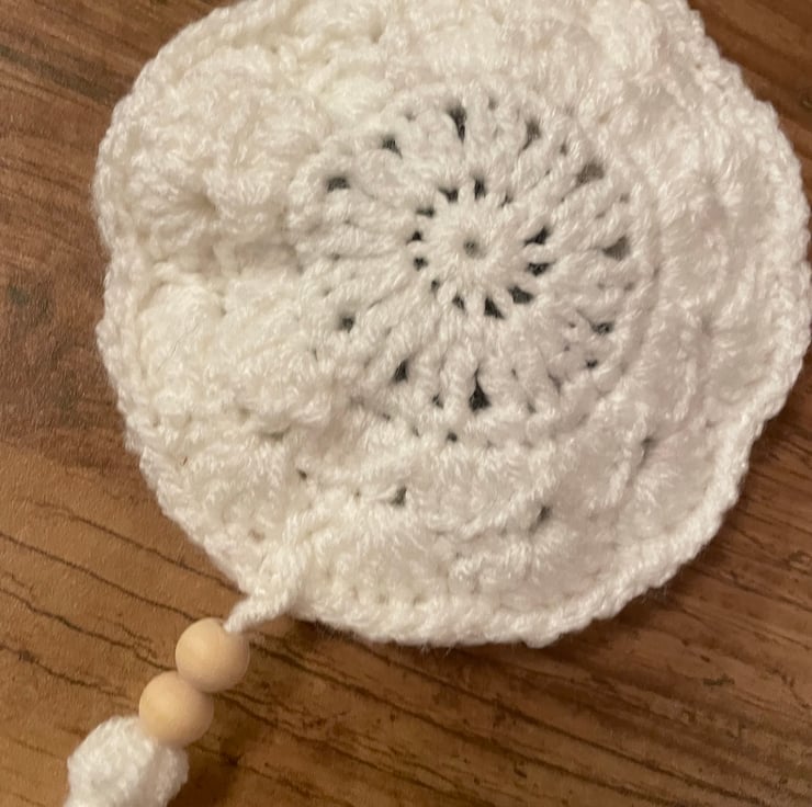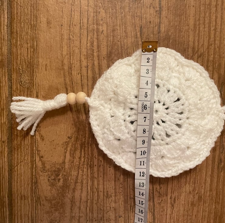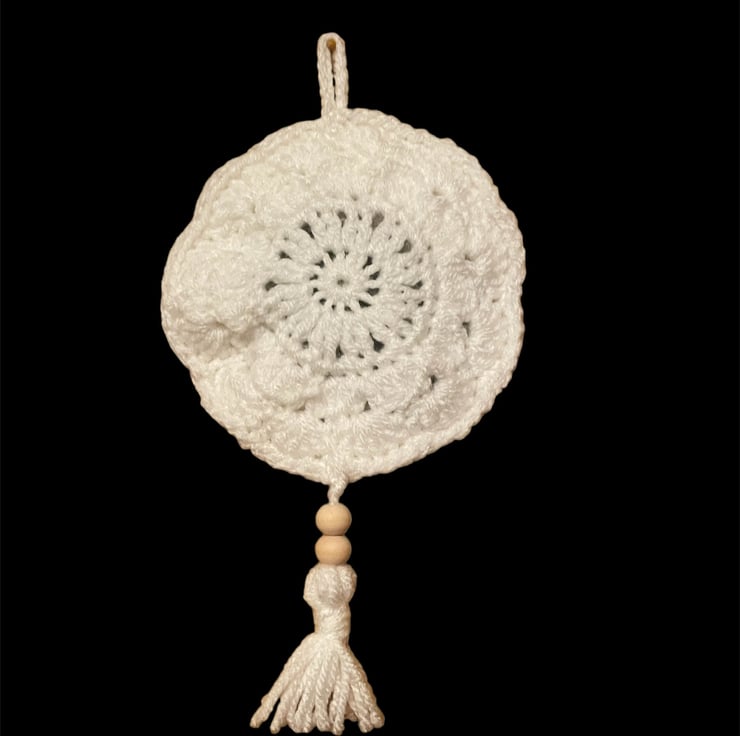 This sachet measures approximately 12 x 21 cm and is crocheted from Acrylic yarn, with an internal filling of rosemary and embellished with a wooden bead.