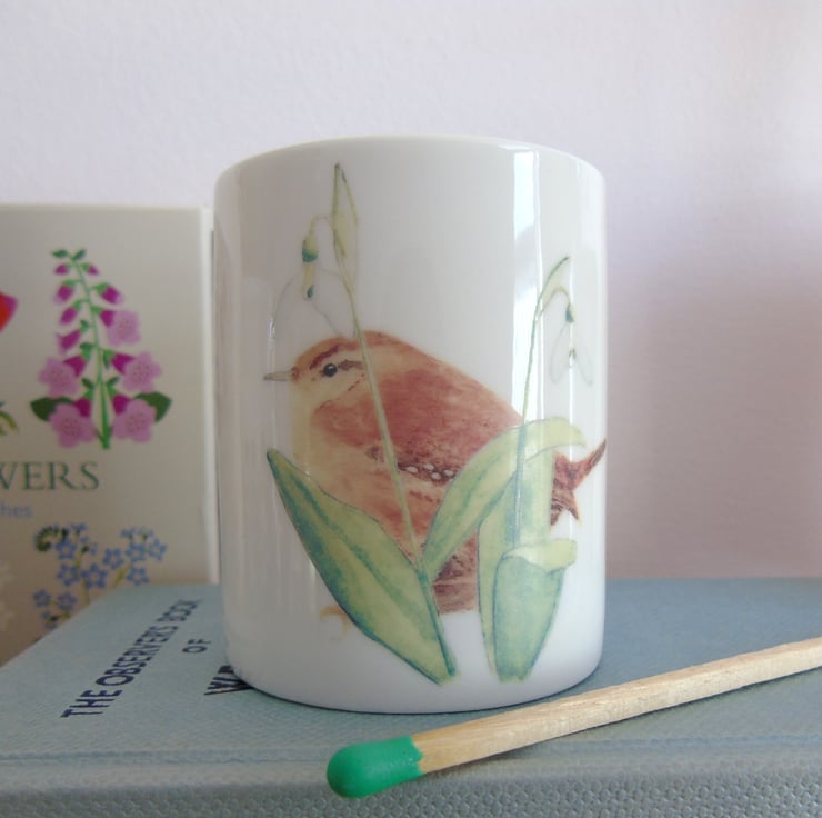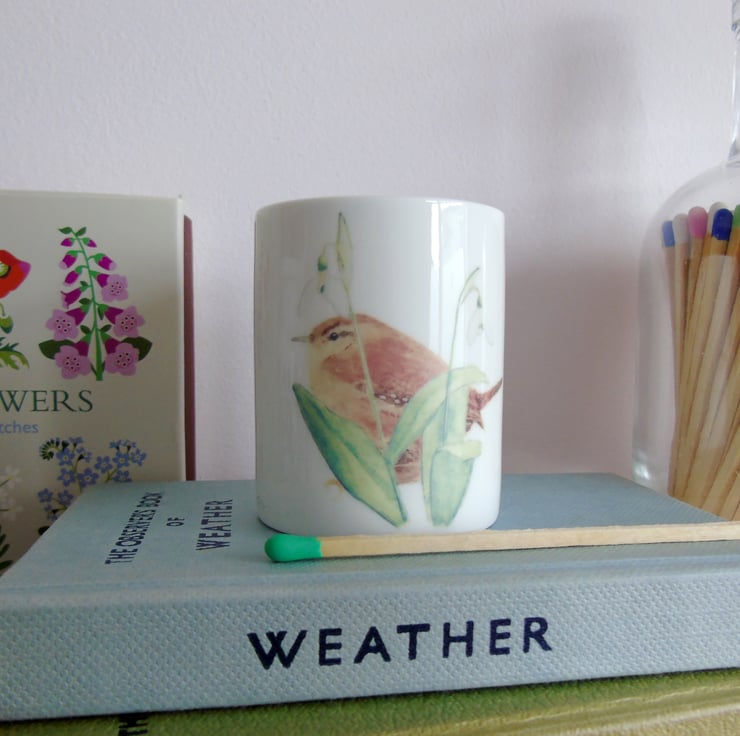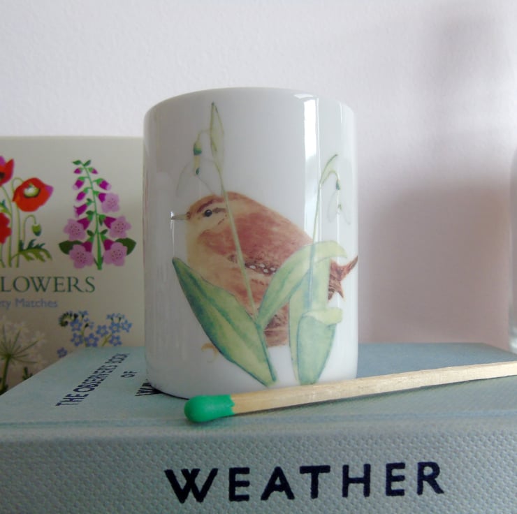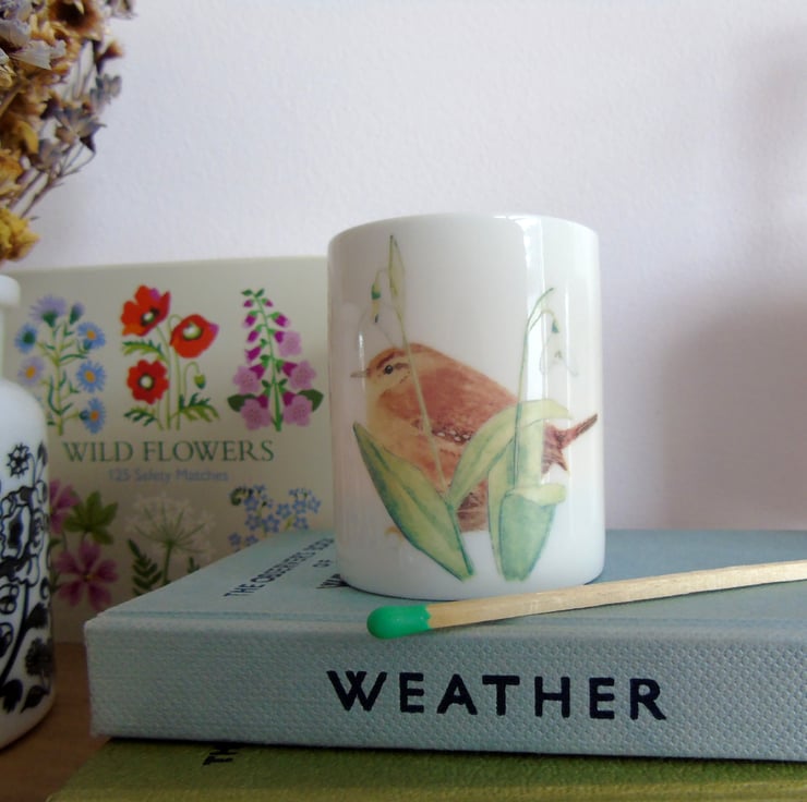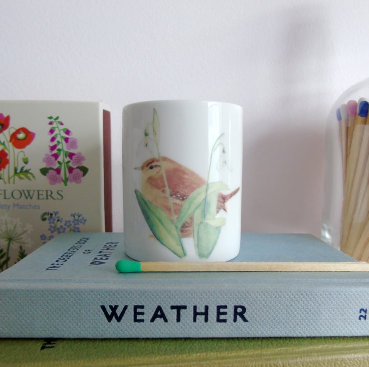 A dainty bone china, tea light holder featuring my delicate wren hiding amongst the snowdrops illustration