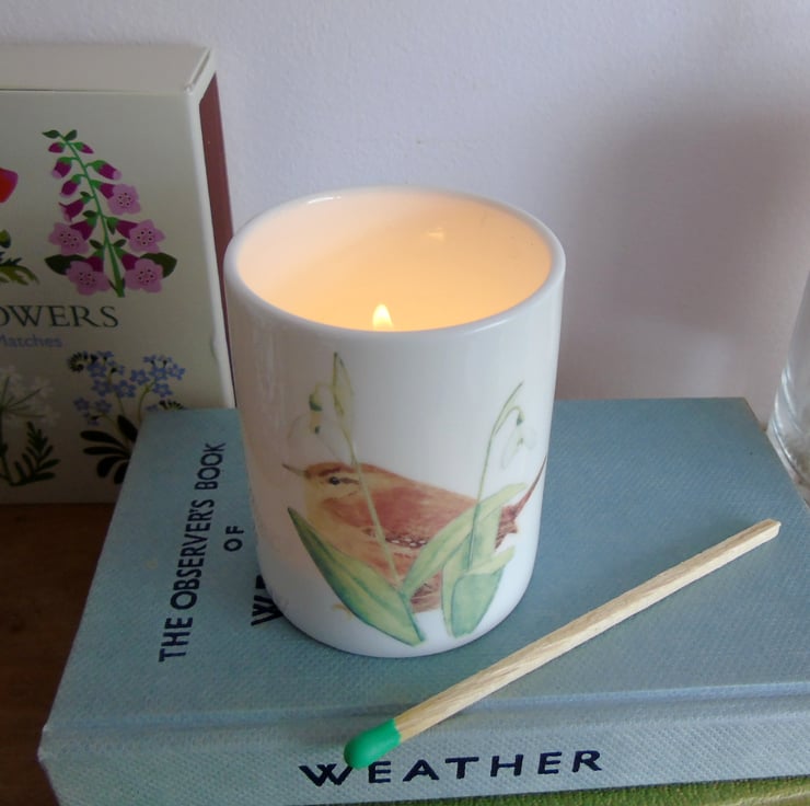 The fine bone china has a translucent quality so the warm glow of the candle flickers through the delicate design, bringing the wren to life.