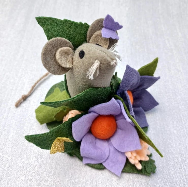 The mouse is surrounded by flowers, leaves and butterflies - her tail is cut from natural hessian twine.