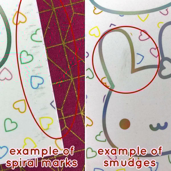 Both designs have smudges, marks from the spiral coil or other small marks or scratches in the foil. The Ghost notebooks have a further issue in that the foil is misaligned over the face leaving white gaps.