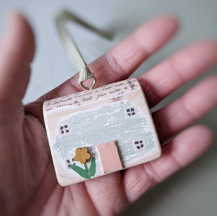 Hand painted with teeny windows and a wooden front door, this one of a kind house hangs on a pretty ribbon.