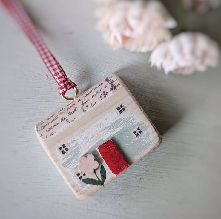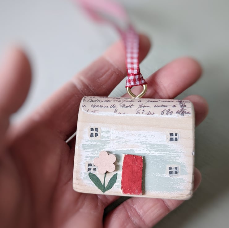 Hand painted with teeny windows and a wooden front door, this one of a kind house hangs on a pretty ribbon.