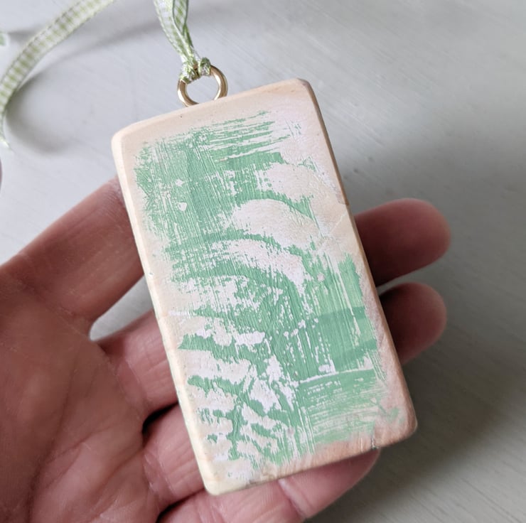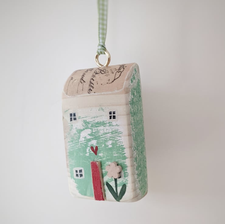Hand painted with teeny windows and a wooden front door, this one of a kind house hangs on a pretty ribbon.