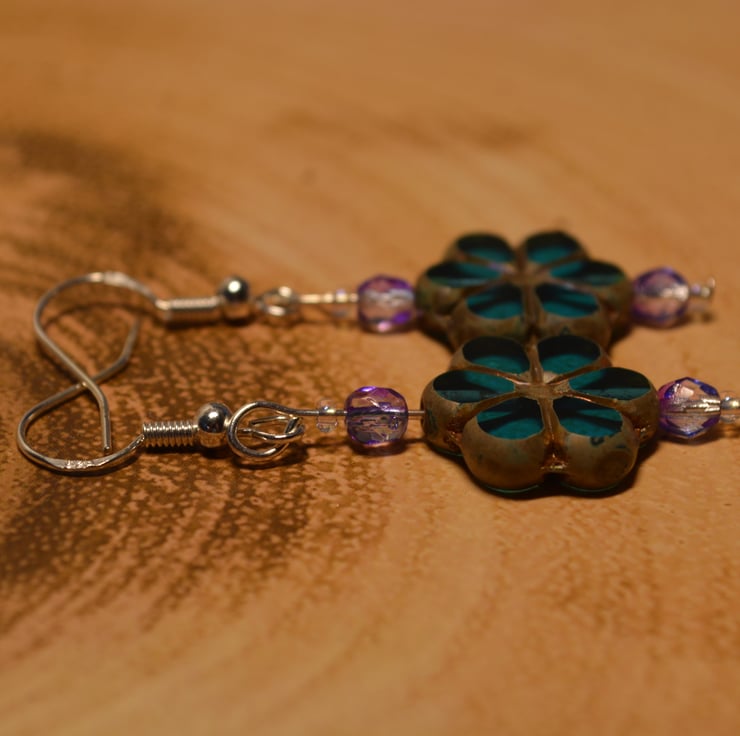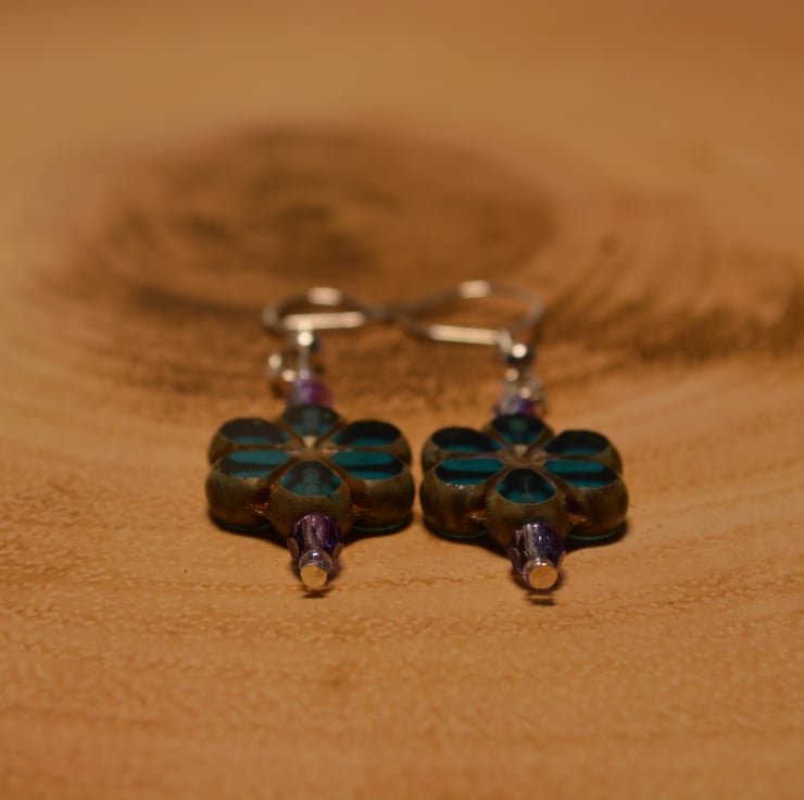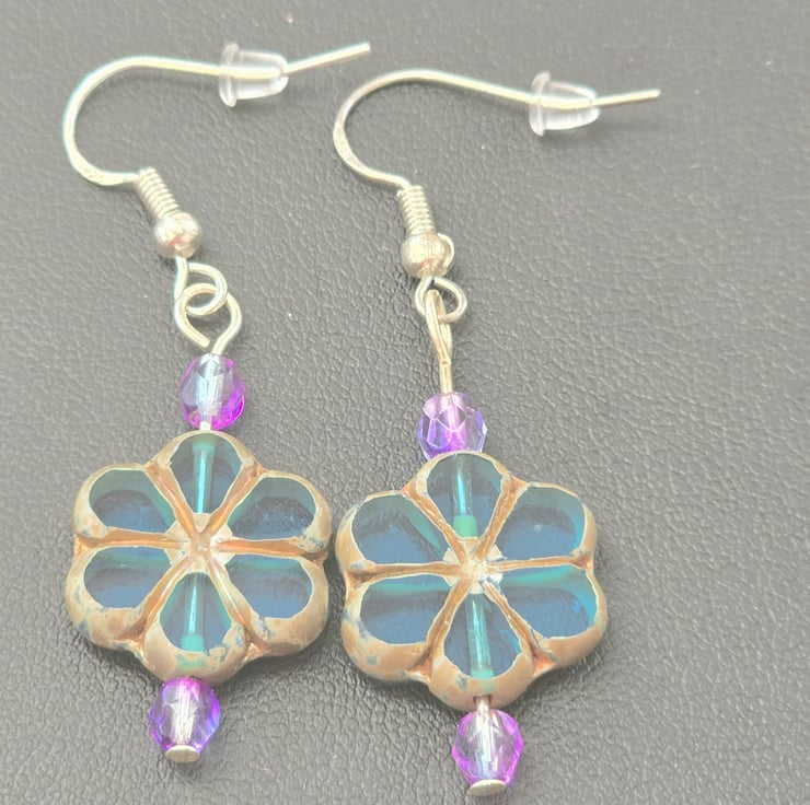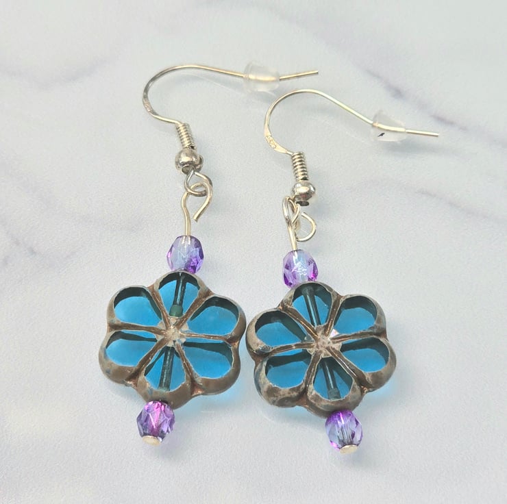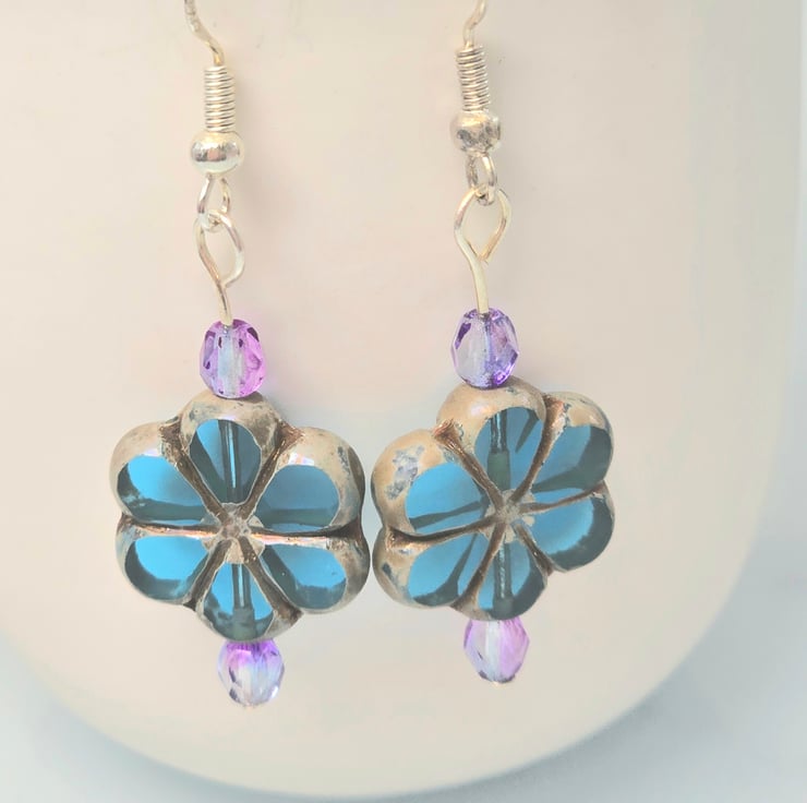 Hawaiian Ocean blue flower with pink purple fire polished beads above and below the flower. The beads are on silver plated pins. The hooks are Silver 925.