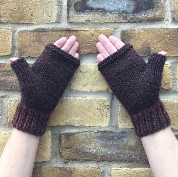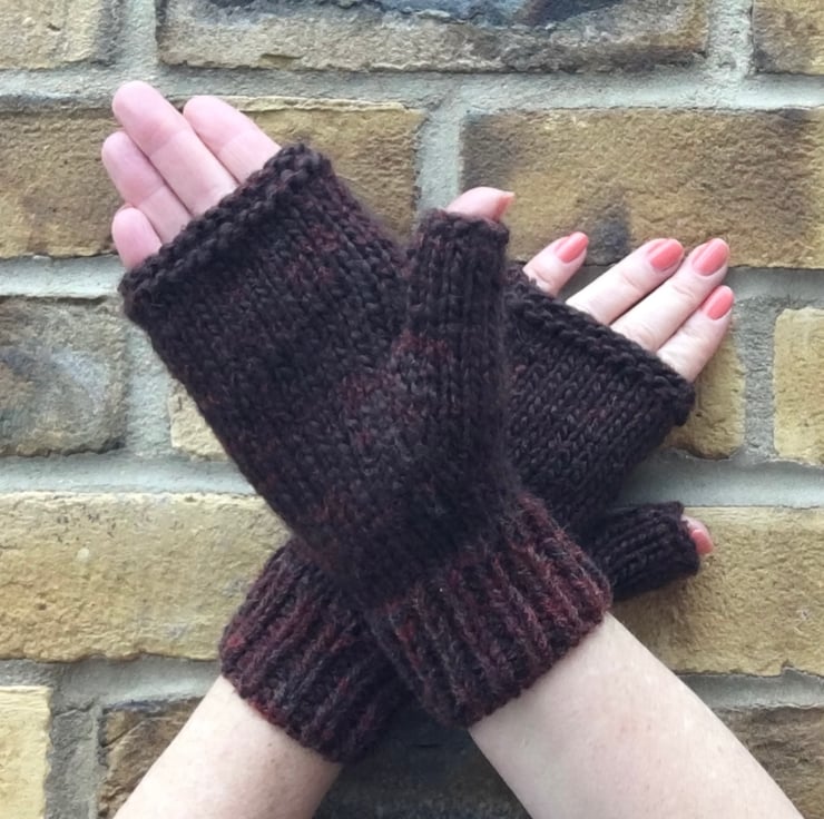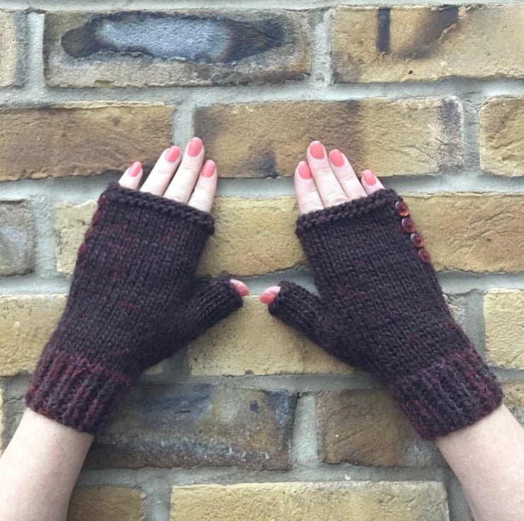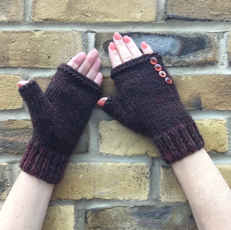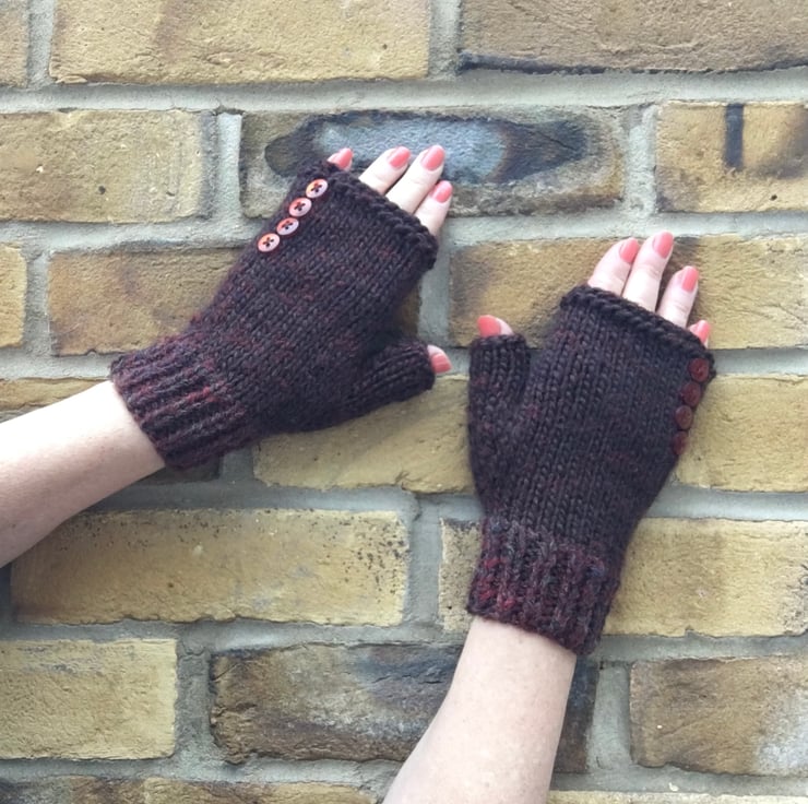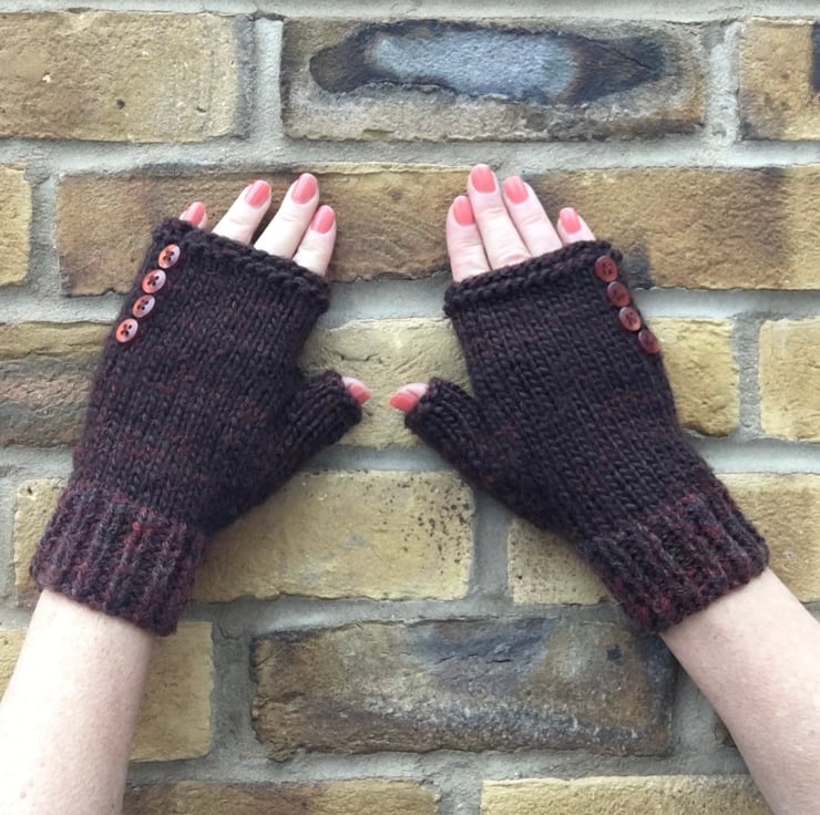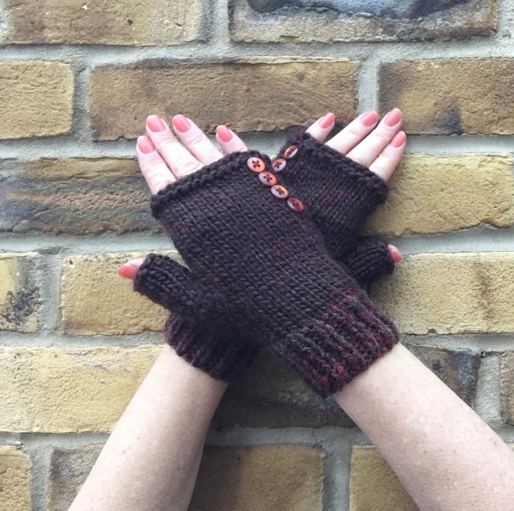 Stay warm in style with these super cosy, hand-knitted chocolate brown fingerless gloves featuring burnt orange buttons and textured rust brown cuffs. Crafted with care to a high standard, these gloves offer a perfect blend of comfort and elegance, making them a delightful addition to any winter wardrobe. Functional fashion as your hands stay warm and your fingers are free to move.