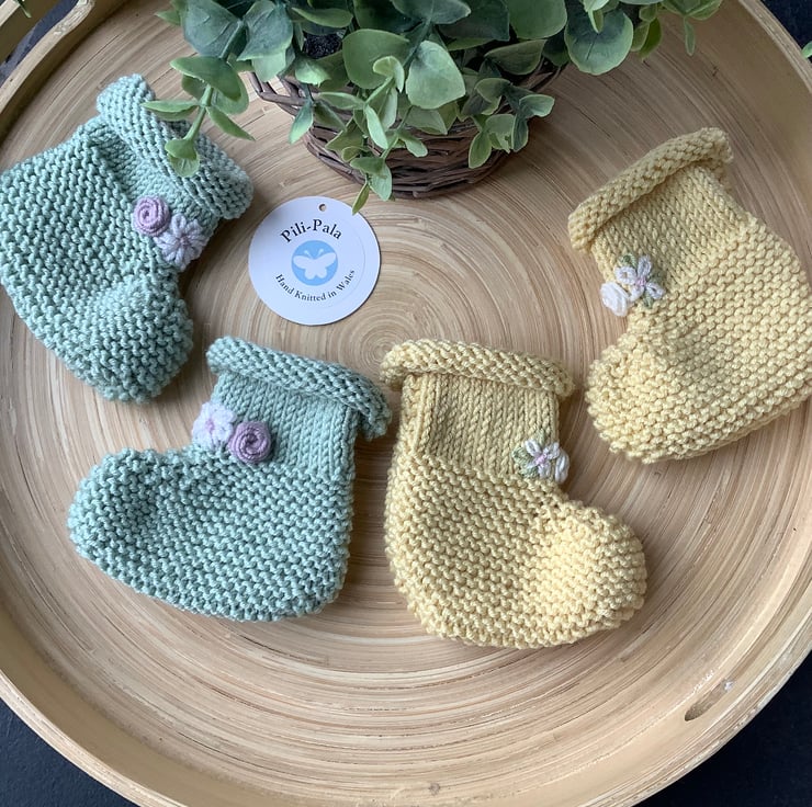 These cute little booties were hand made by me. They are for 0-6 months and knitted in a soft warm cashmere blend wool. They are primrose yellow in colour and hand embroidered with flowers.