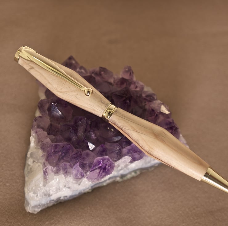 The yellow gold plate of the tip, clip centre band and top finial compliment the tan colour of the wood, and the pen uses a Cross refill (black ink supplied) which is easily changed by simply pulling both ends of the pen apart and unscrewing the end of the now exposed refill. The writing nib is propelled and retracted by rotating both halves of the pen in opposite directions.
