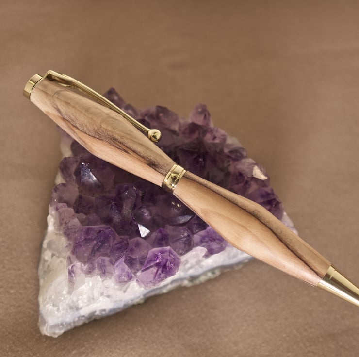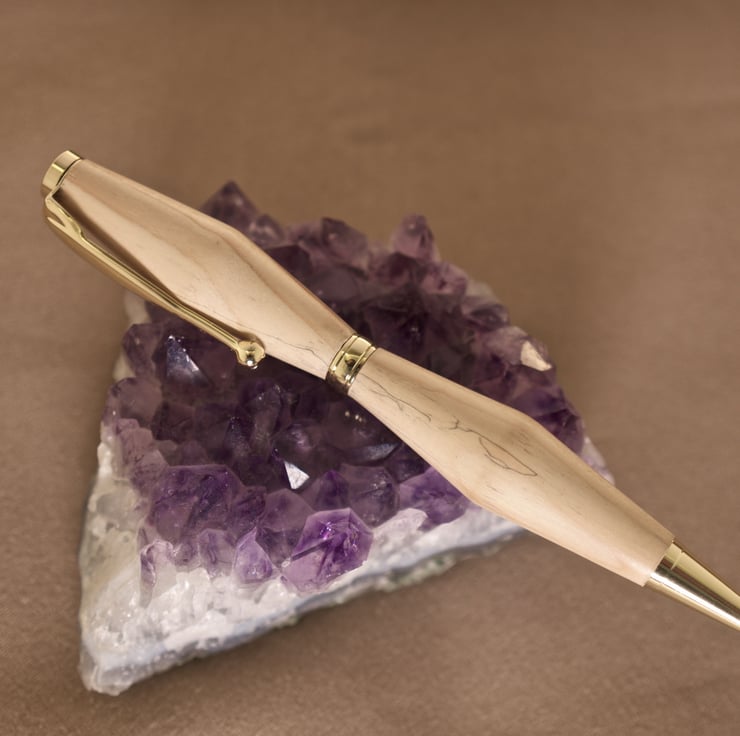 Hand crafted wood pen made with yew. This is another of my hand crafted twist pens made from the wood tree that was around 300 years old. The poor tree got struck by lightning and had to be felled around ten years ago. I have given the barrels an angular shape, with the widest points set to the centre, so keeping the balance of the pen at the centre. The wood has dramatic dark lines of spalting - a natural process that occurs as the tree grows.