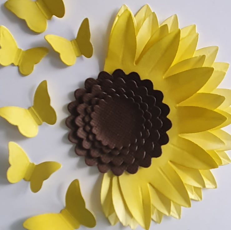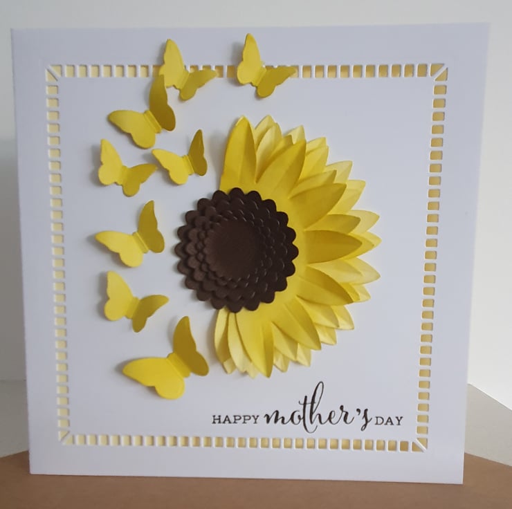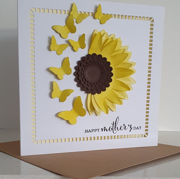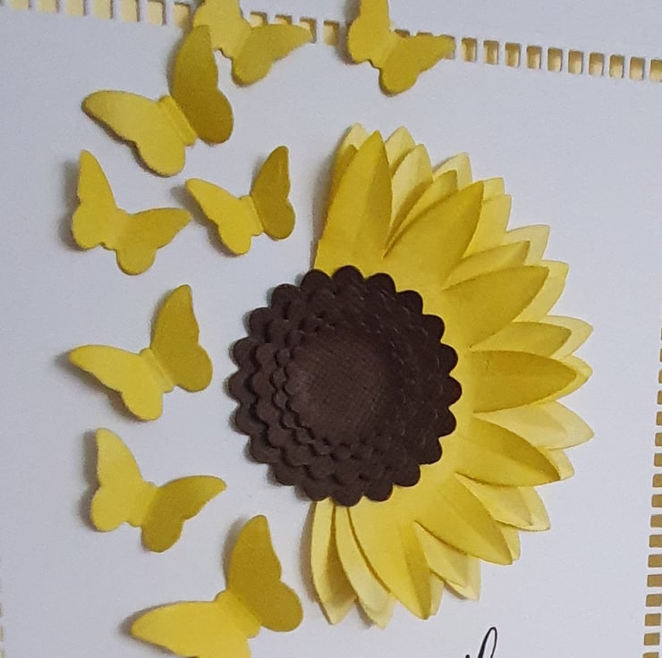 This vibrant, pretty yellow sunflower card has matching yellow butterflies flying out around the petals. The card base is approx 6x6 and includes a kraft card envelope.
