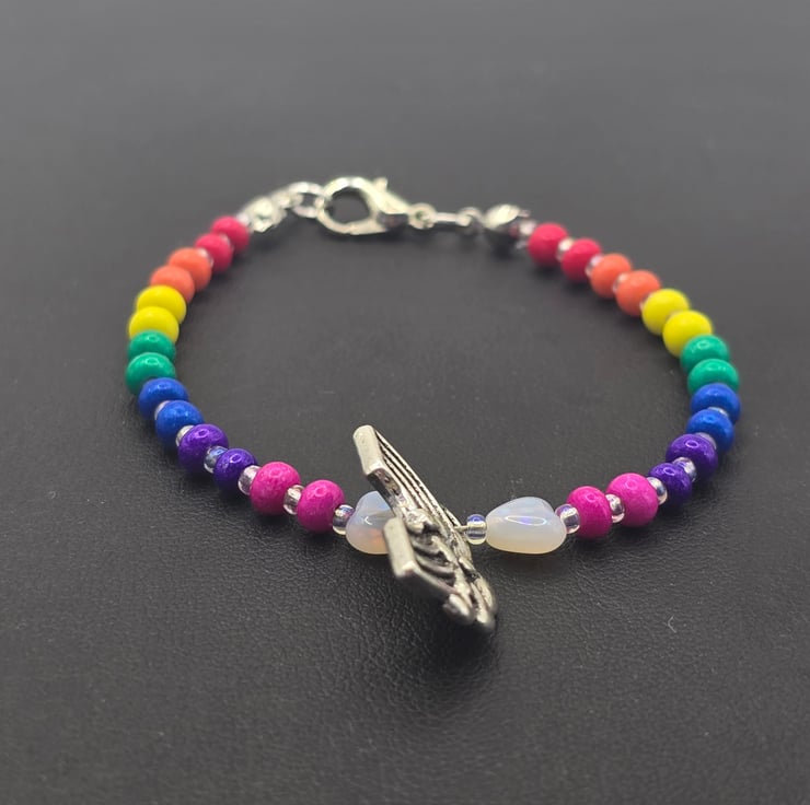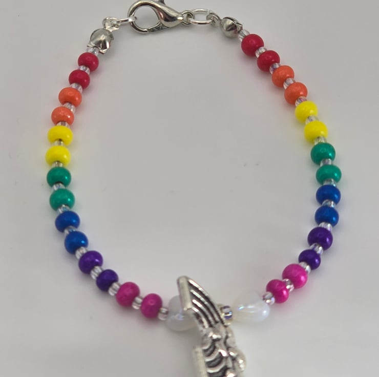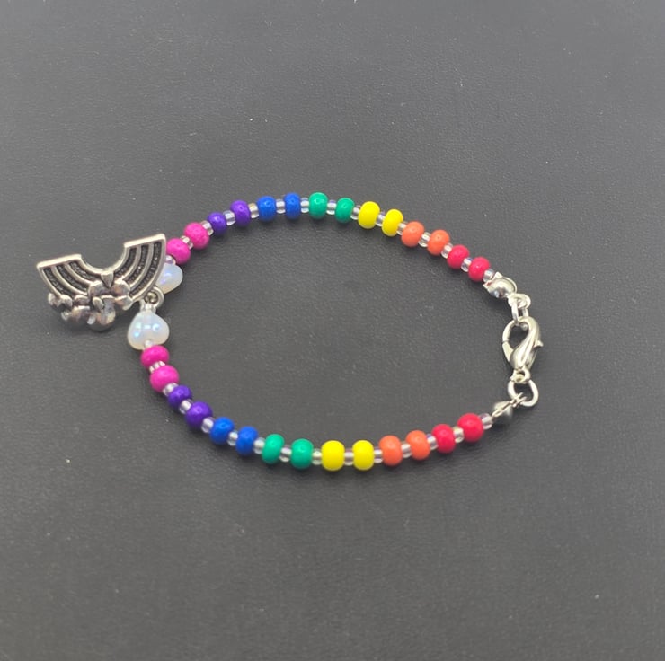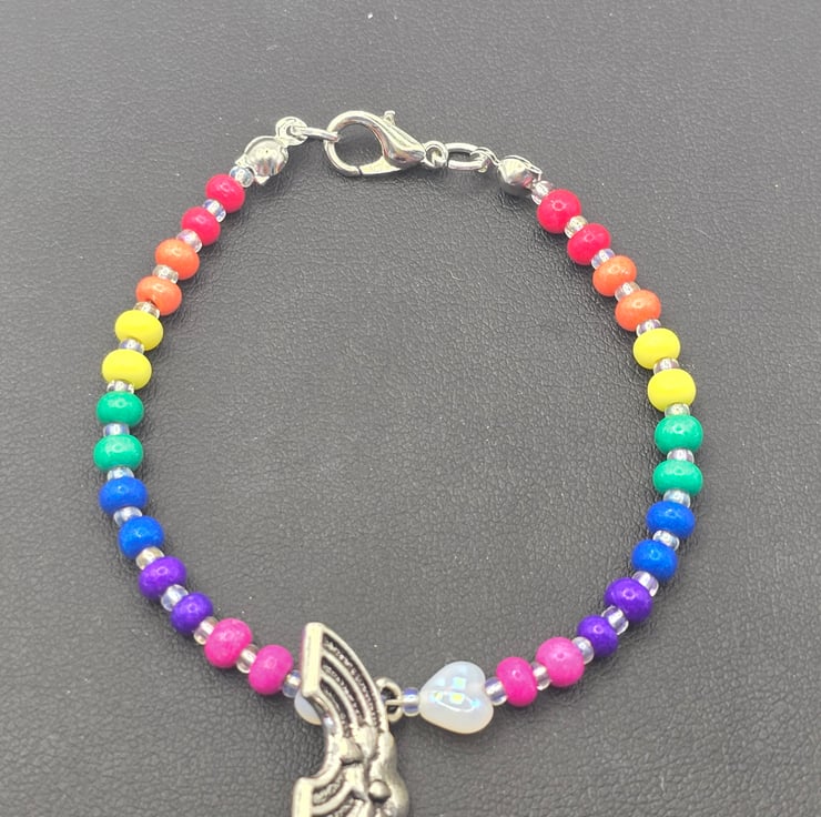 The bracelet was made using rainbow coloured large seed beads with small clear seed beads, 2 white peacock hearts and a sliver rainbow charm in the centre of the bracelet.