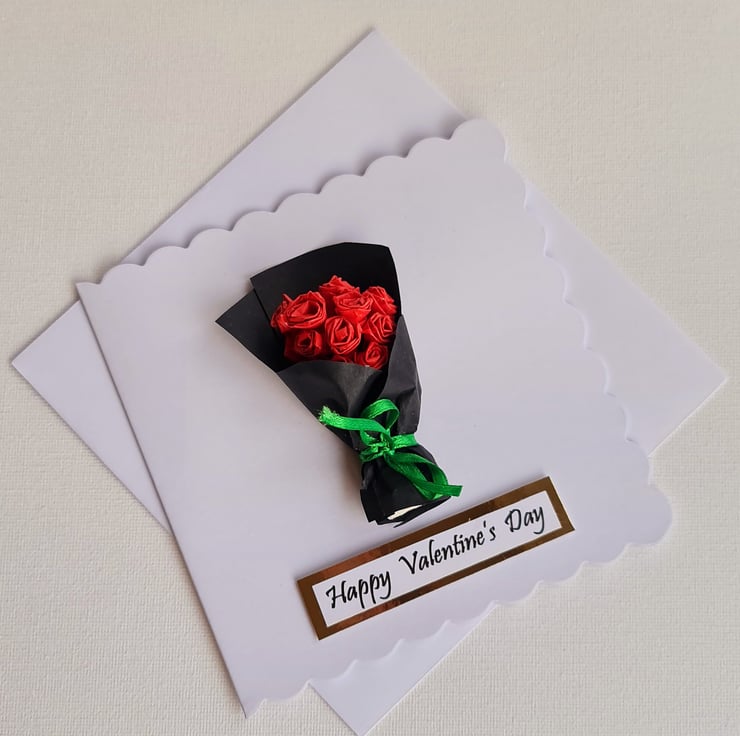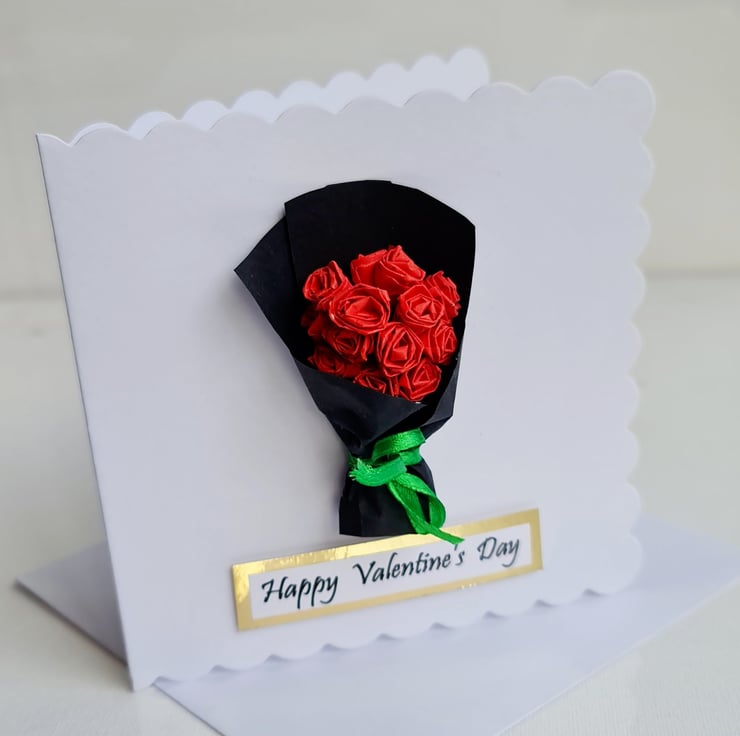 A beautiful handmade card featuring a BOUQUET of RED ROSES. A one of a kind 3D Card, made from the Origami Paper Folding Technique. Thoughtfuly created with vibrant contrast colours to stand out.