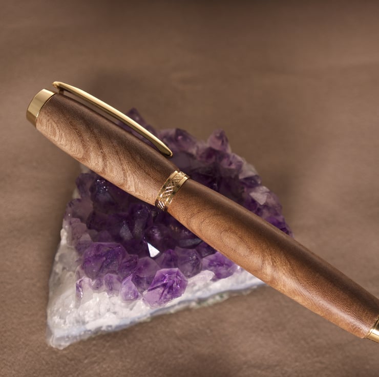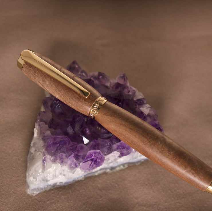 The gold plated tip, clip, centre band and top finial with black accents compliment the tan colour of the wood, and the gentle taper to the tip section make this pen very easy to hold. The refill is easily changed by unscrewing the tip, taking care not to lose the small spring.