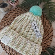 Made in a mint green colour way with tiny little speckles of a lilac pink from a lightweight yarn so won't feel heavy if you wear over a top or with a jacket.