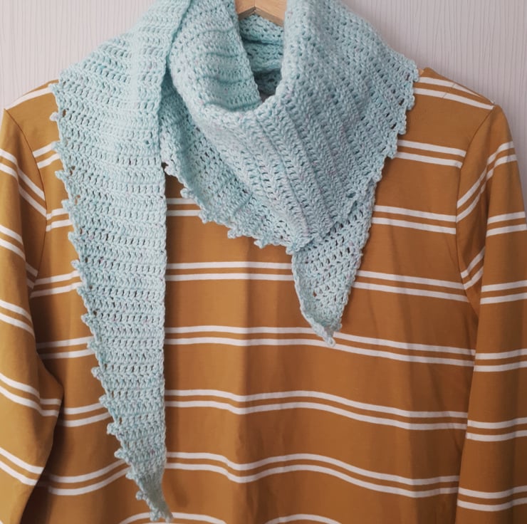 A versatile crochet wrap that can be used as a scarf worn in a number of ways or as a shawl. A triangular shape longer across one half it's fab for wrapping round like a scarf leaving a longer point at the front so the cold doesn't get in the front of your coat or jacket. Leave the ends longer and it'll sit higher looking great over a top for a splash of colour. It can even be wrapped round your shoulders like a traditional shawl.
