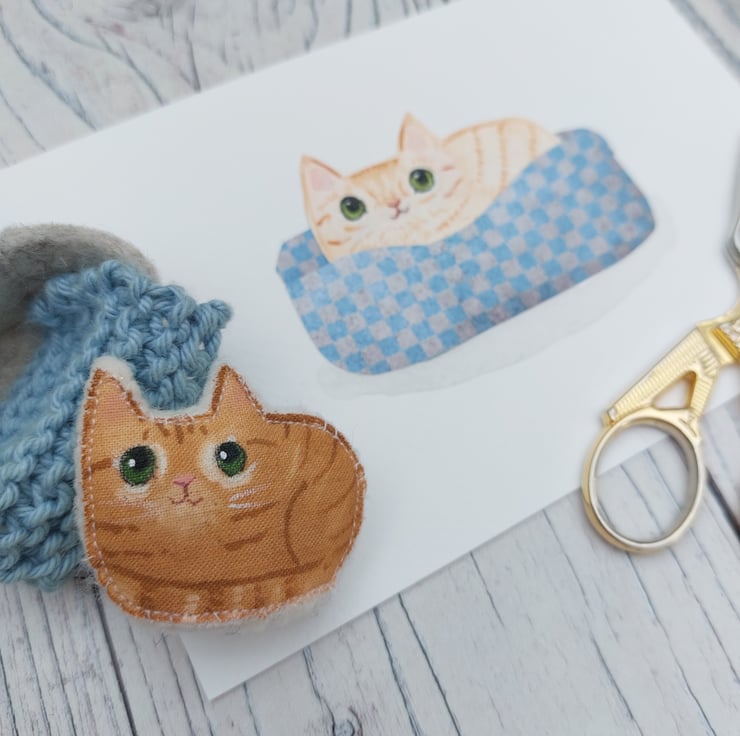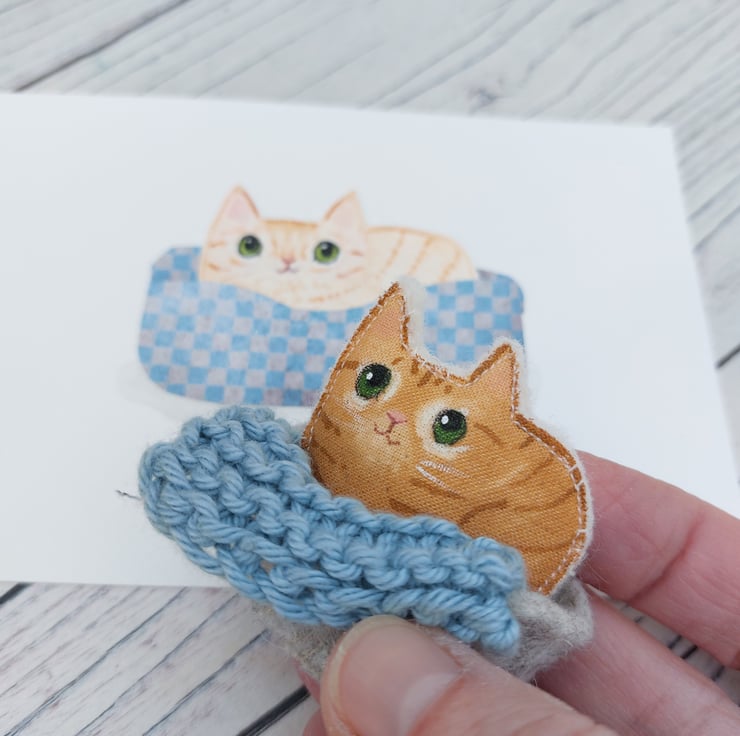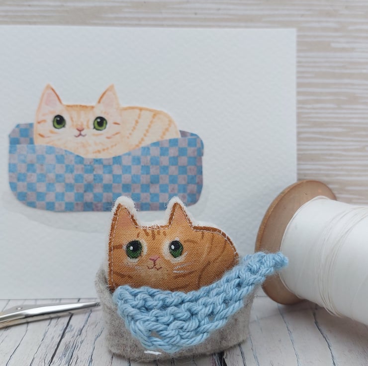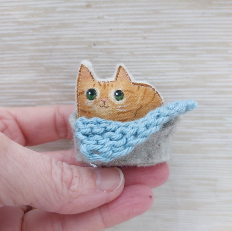 Little fabric cat in a basket ; the cat ornament is hand painted fabric sewn onto felt to create an ornament that can sit independently, kitty comes with her own grey felt basket and knitted blanket.