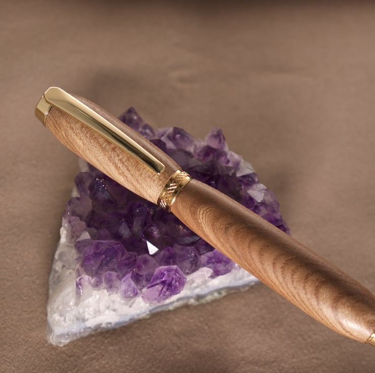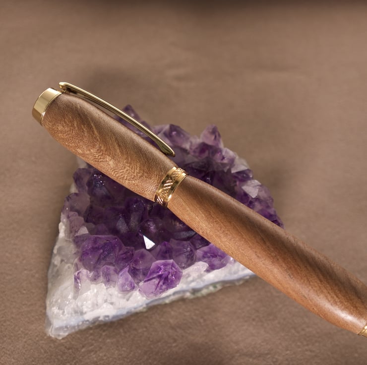 The gold plated tip, clip, centre band and top finial with black accents compliment the tan colour of the wood, and the gentle taper to the tip section make this pen very easy to hold. The refill is easily changed by unscrewing the tip, taking care not to lose the small spring.