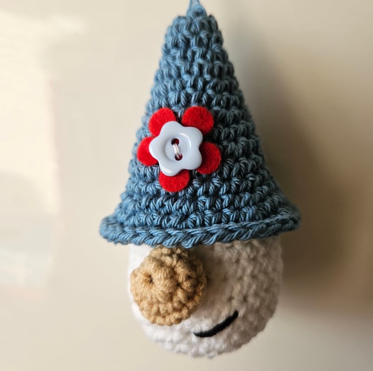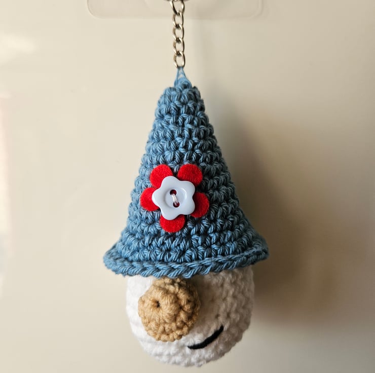 This keyring, featuring a cheeky gnome, wearing a hat embellished with a red flower, has been hand crocheted using quality cotton yarn, and will make a perfect gift or keepsake for any occasion.