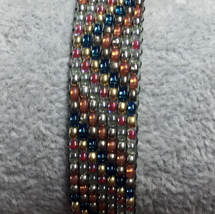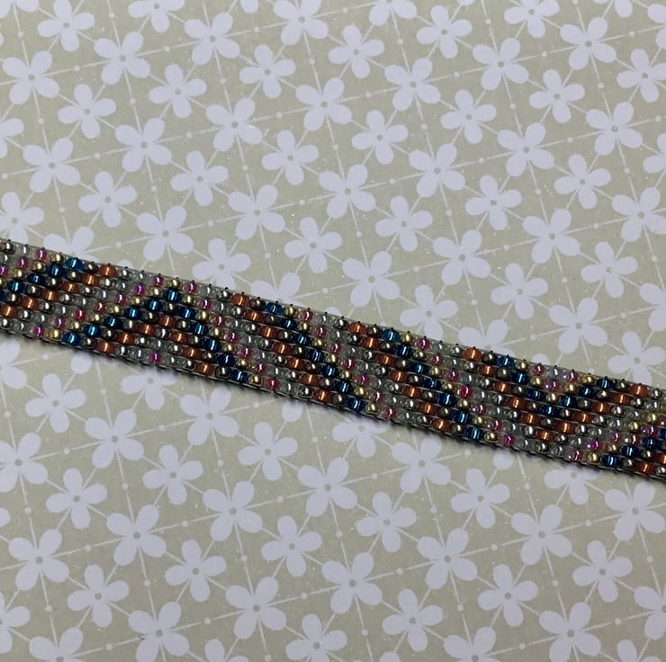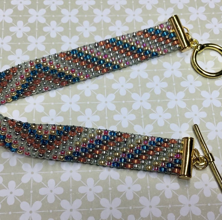 Made using a Loom, this bracelet is made from 11/0 seed beads in a diagonal pattern of mixed colours. With the gold plated toggle clasp it is a very sparkly and pretty piece of jewellery.