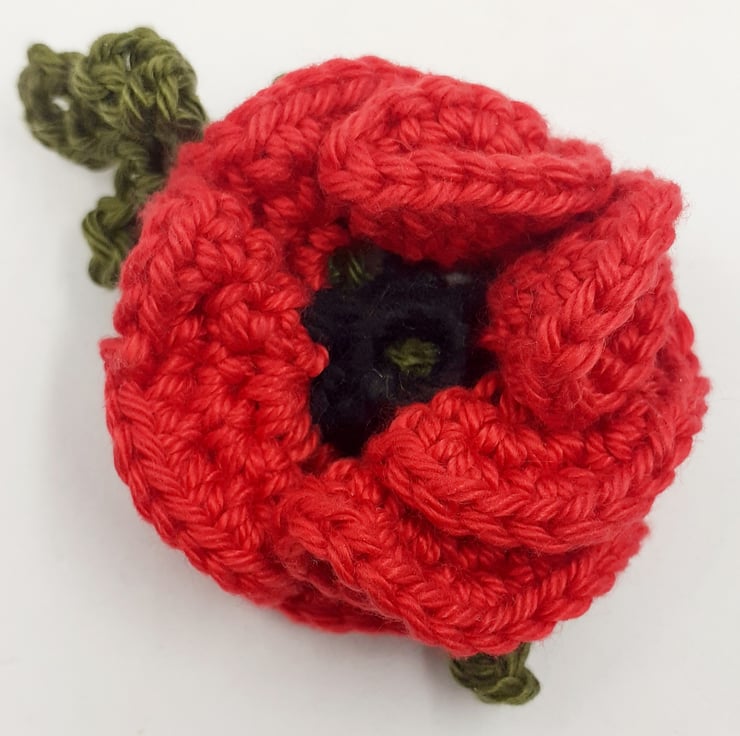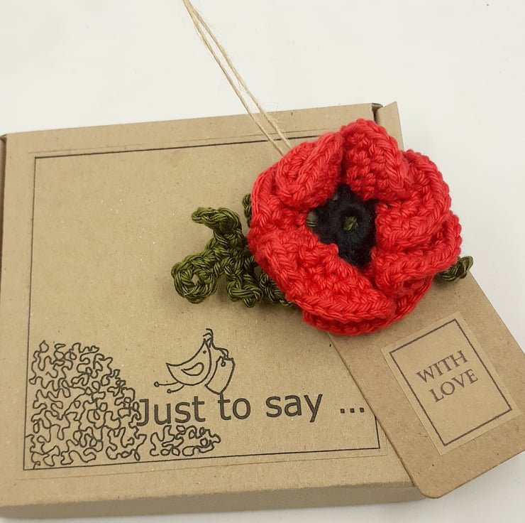 This bright poppy brooch is presented on a tag and would make a pretty keepsake alternative to a greetings card. It is crocheted in cotton and backed with strong craft felt. The metal brooch finding is firmly sewn in place. The flower head measures approximately 7 cm in diameter and the brooch is approximately 9 cm at its widest point. The tag reads, 'With Love' although I am very happy to exchange this tag for one with wording of your choice.