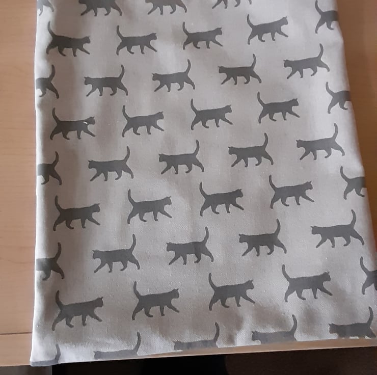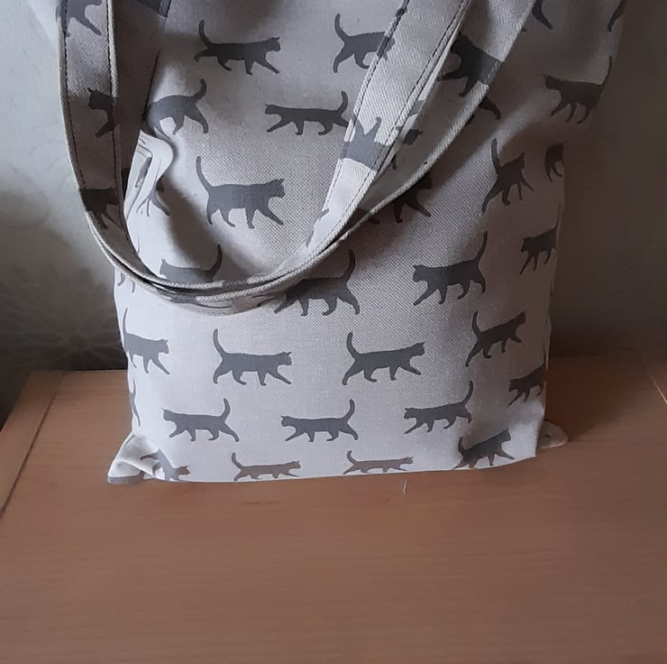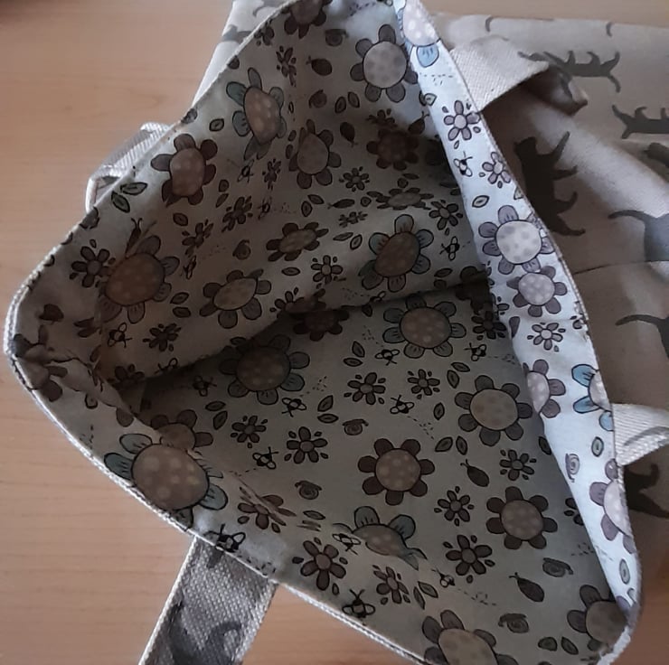 Tote bag with all over cat print. Beige/brown colour. Out made from cotton linen, inner lining is 100 per cent floral cotton fabric. Size 11.5" (29cm) wide x 13" (33cm) deep. Lovely mothers day gift or for a cat lover. Hard-wearing fabric.