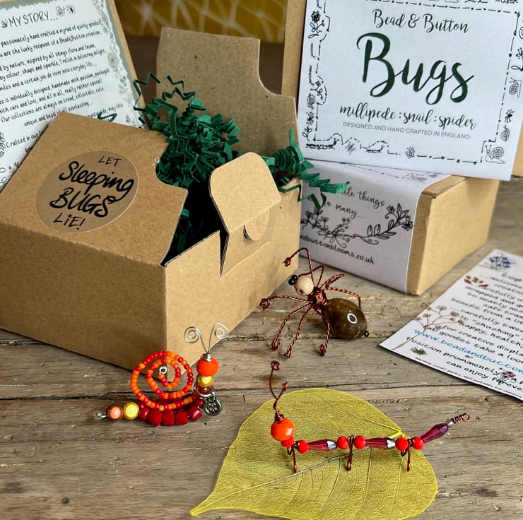 As the name suggests, we use beads of all sizes and shapes, buttons, scraps of haberdashery, ribbons, sequins, embroidery trims & a variety of wire to create our delightful and everlasting creations, and this means that each one is slightly different to its peers. Handmade and charmingly packed in our signature boxes with our own hand drawn Bugs wrap & outer sleeve. We can also send directly as a gift to your loved one at no extra cost - please just send us a message.