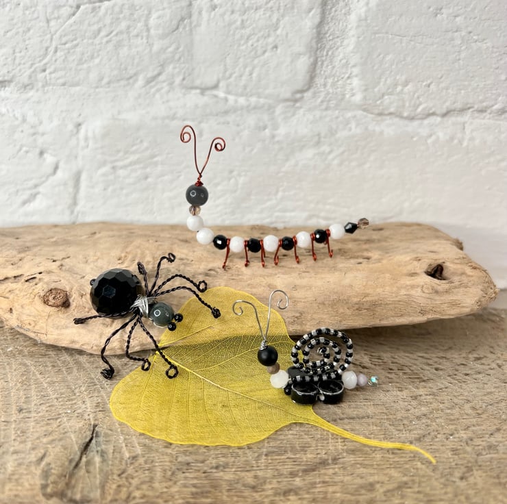 Our trio of bugs are delightful - three individually made little creatures with their own personalities who arrive nestled in their own box complete with tissue 'grass' and a real skeletonised leaf. Each bug is made entirely by hand, using a variety of buttons, beads & wire. Who wouldn't want a beaded spider, a curly beaded snail and a 'centipede'? Put them somewhere to make you smile, give them to a friend, pop them with your house plants. This is the black & white set. Please note - not a toy, not suitable for small children.