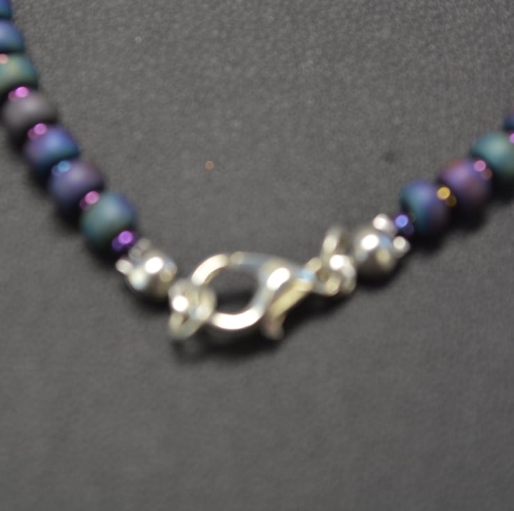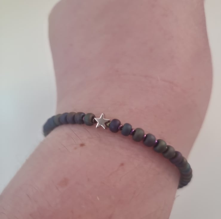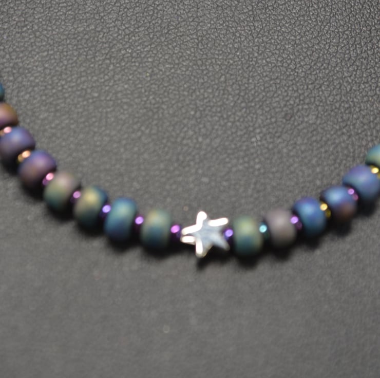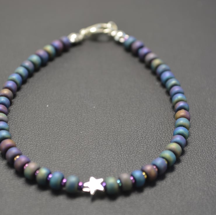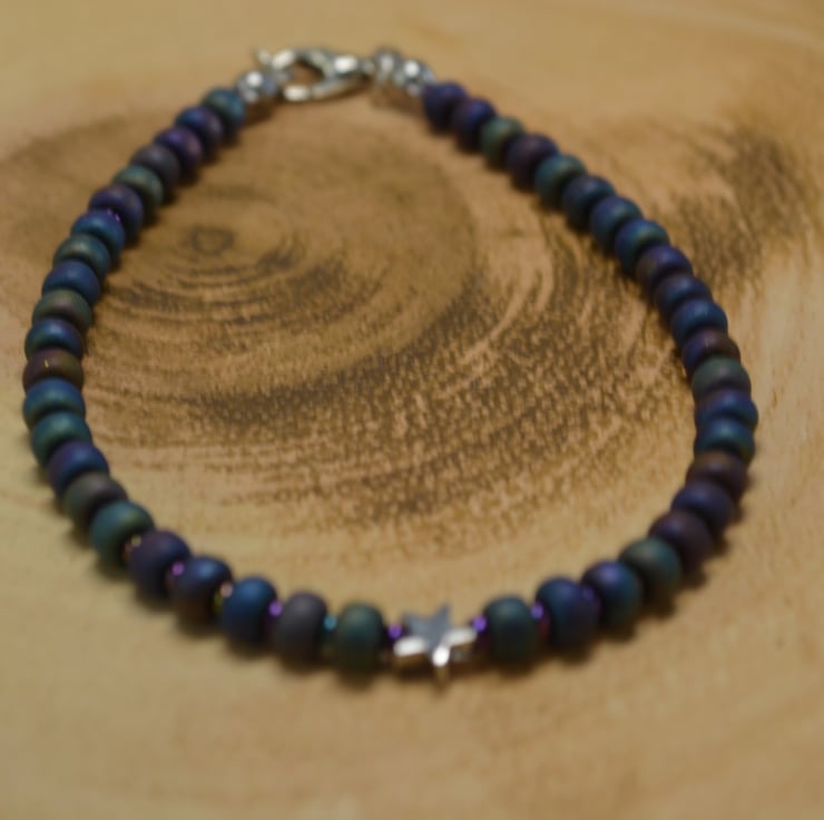 The bracelet is made using larger matt black seed beads and small metallic seed beads, the seed beads have different colours such as dark blue, purple and green along with the black colour. The bracelet has a metal silver star in the centre of the bracelet.
