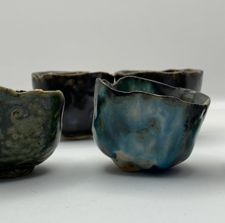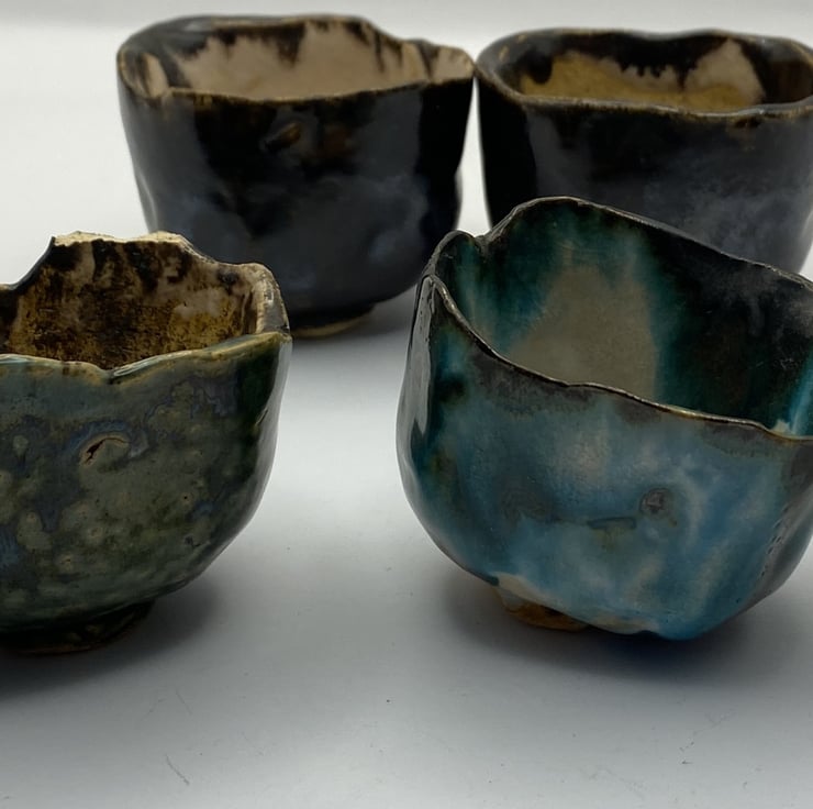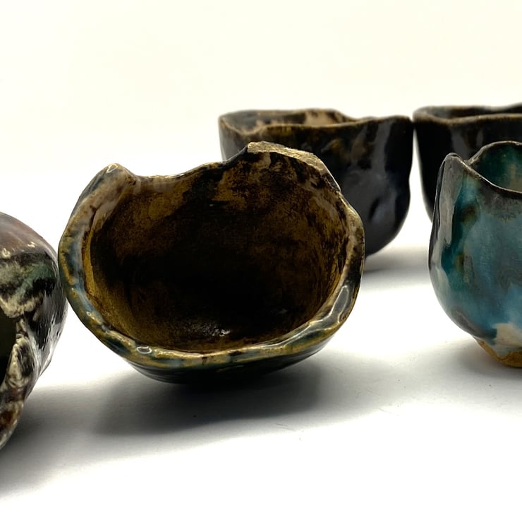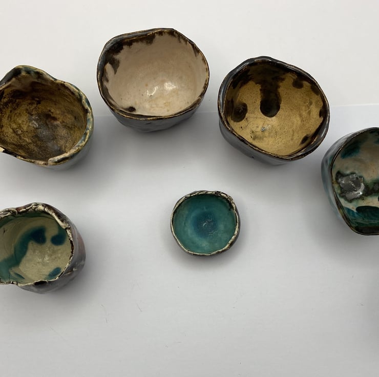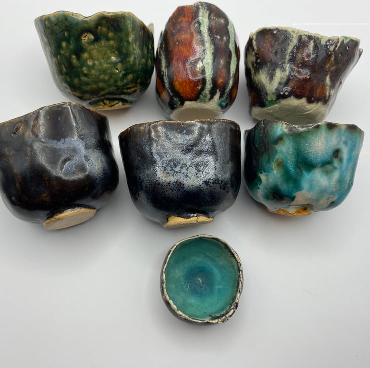 A job lot of pottery seconds. Seven items in total. These pots were experimental pieces for glazes, firing temperatures and decoration style. The lot contains earthenware and stoneware handmade pinch pots. All items are approx 4cm to 5cm high.