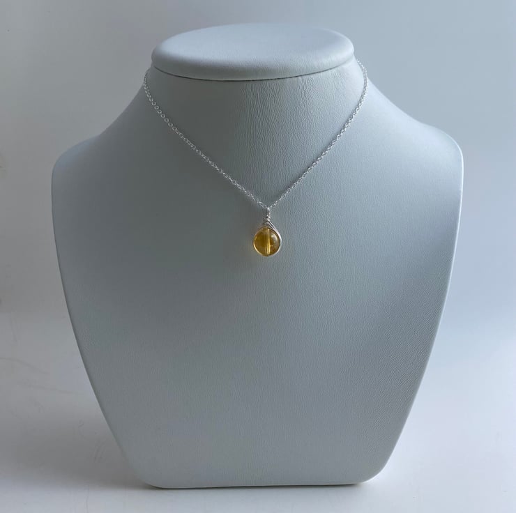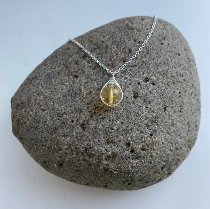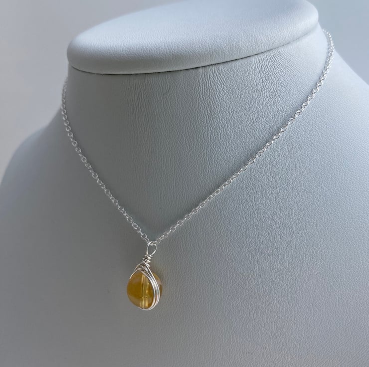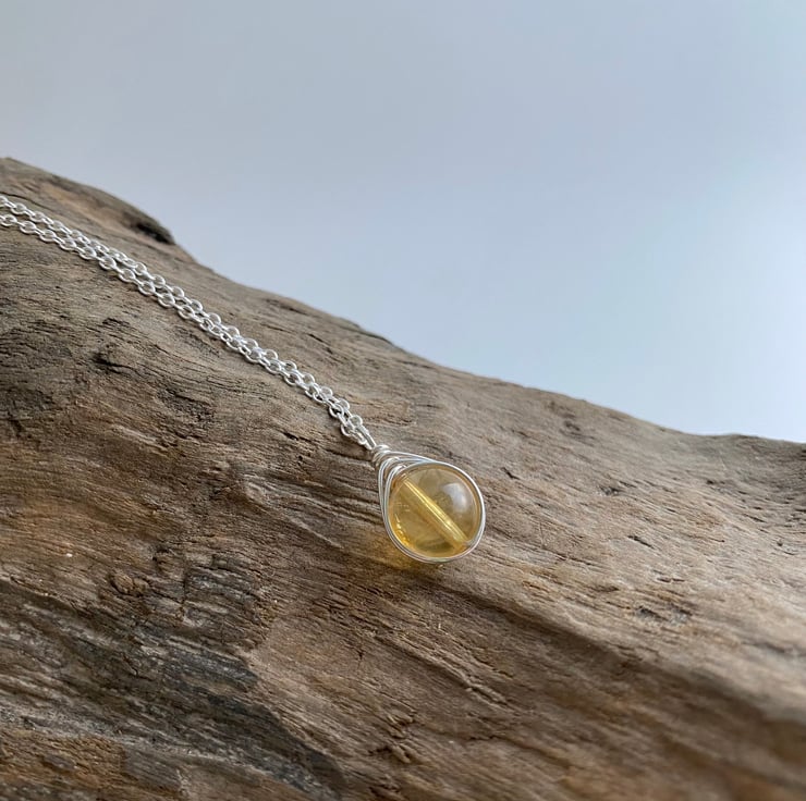 Beautiful Citrine and Sterling Silver wire wrapped drop necklace. Sterling silver wire wraps around a beautiful genuine Citrine bead. Striking yellow colour, with speckles of orange and white.