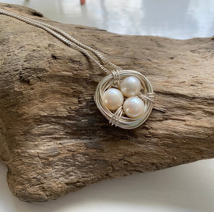Beautiful Freshwater Pearl Nest Necklace. Sterling silver wire wraps around beautiful genuine A grade Freshwater Pearls. Striking natural colour. The understated 24-inch Sterling Silver heavy curb chain perfects the look of this elegant necklace. This necklace perfects both casual and smart attire. Pearl is the birthstone for June.