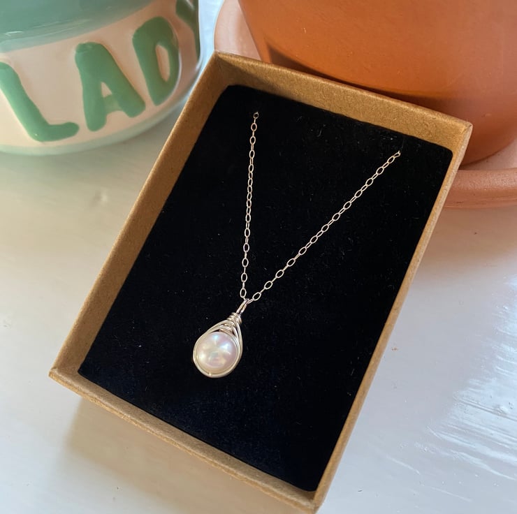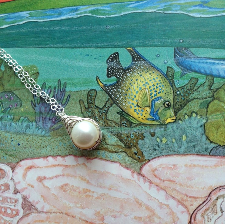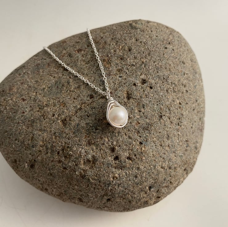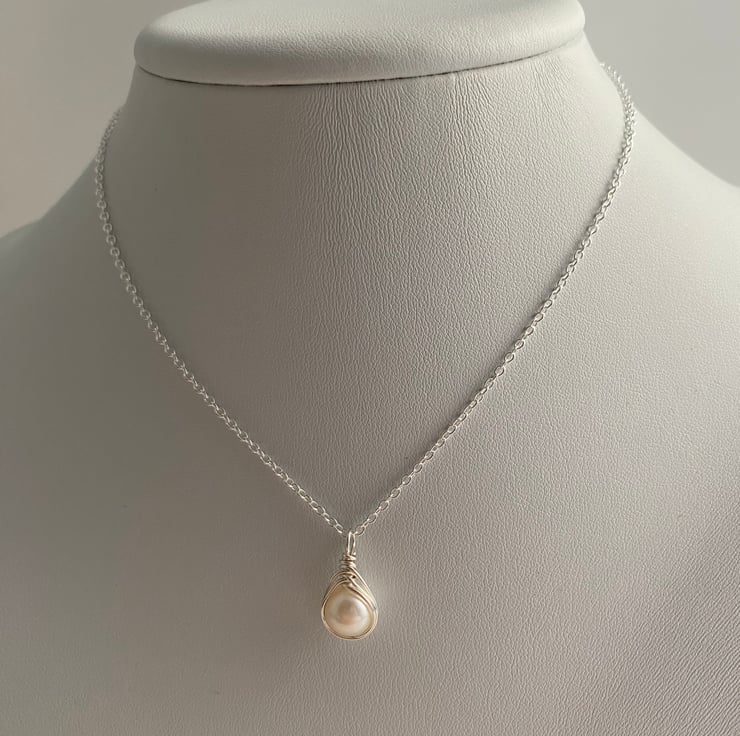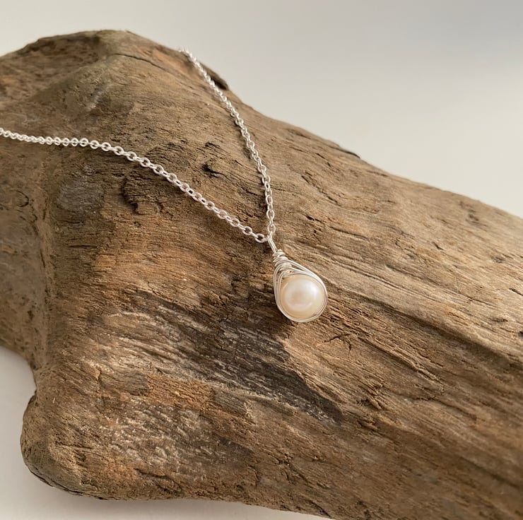 Beautiful Freshwater Pearl Drop Necklace. Sterling silver wire wraps around beautiful genuine A grade Freshwater Pearls. Natural ivory white round pearls. The understated sterling silver trace chain perfects the look of this elegant necklace. This necklace perfects both casual and smart attire. Pearl is the birthstone for June.