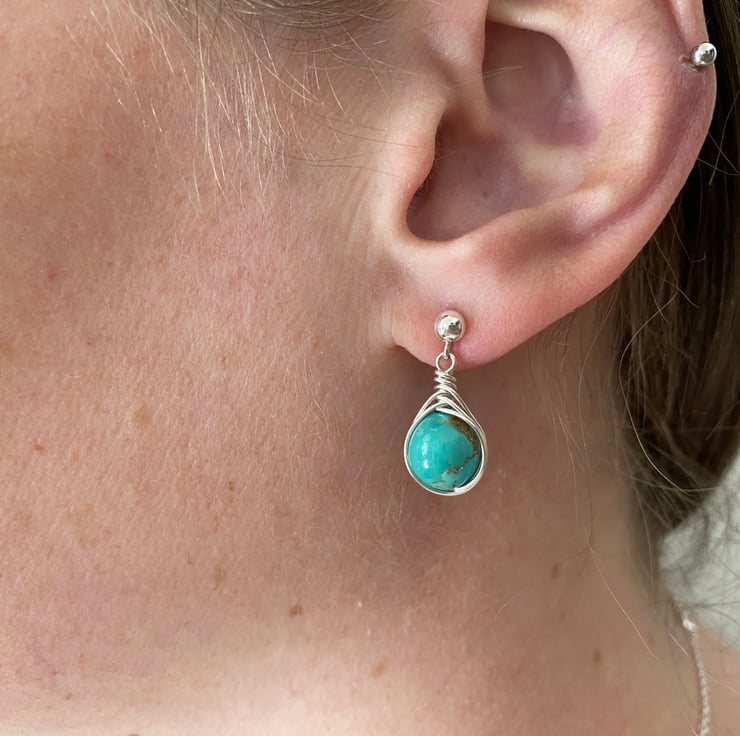 Beautiful certified Kingman turquoise and sterling silver wire wrapped drop necklace and earrings set. Sterling silver wire wraps around genuine turquoise beads from the Kingman Mine in Arizona. Striking natural blue/ green colour.