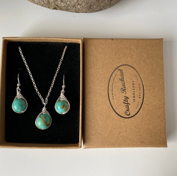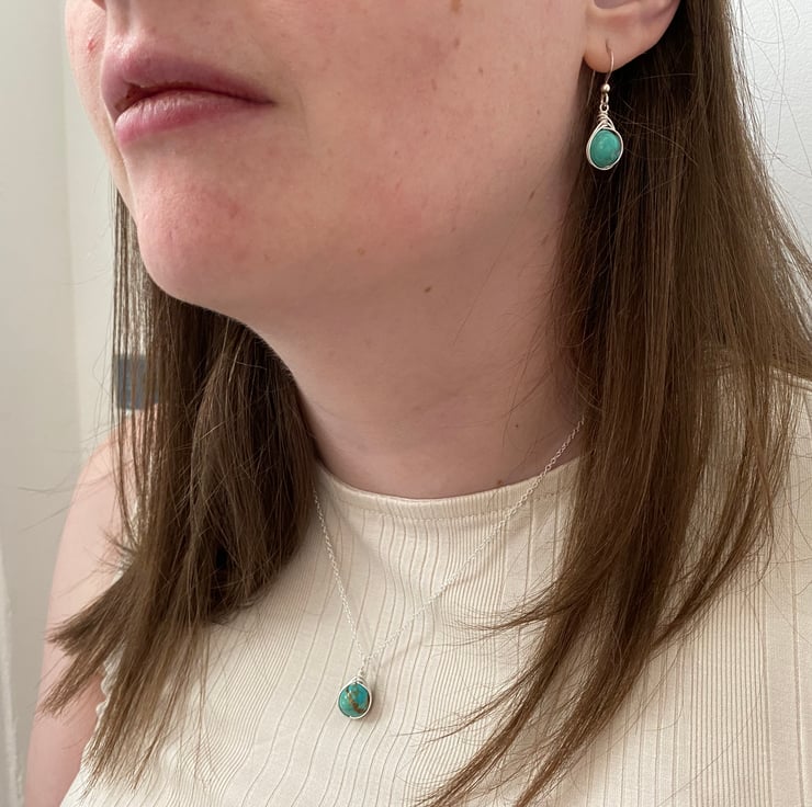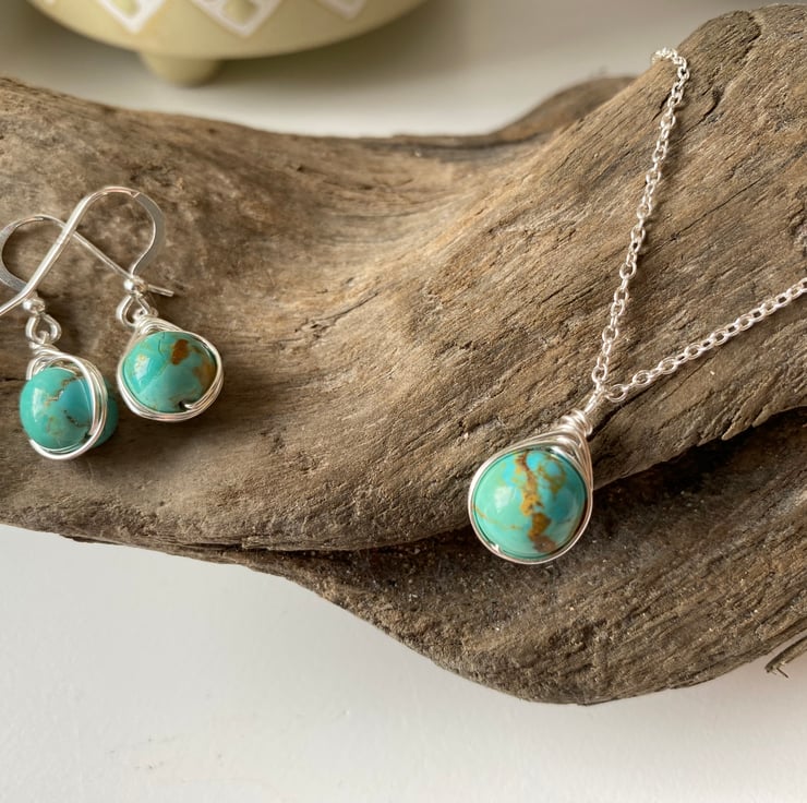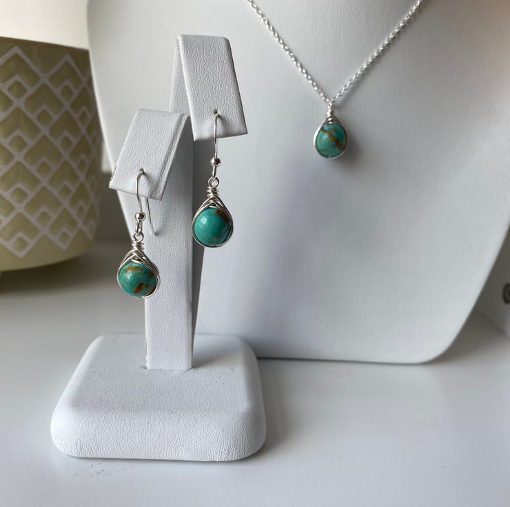 Beautiful certified Kingman turquoise and sterling silver wire wrapped drop necklace and earrings set. Sterling silver wire wraps around genuine turquoise beads from the Kingman Mine in Arizona. Striking natural blue/ green colour.