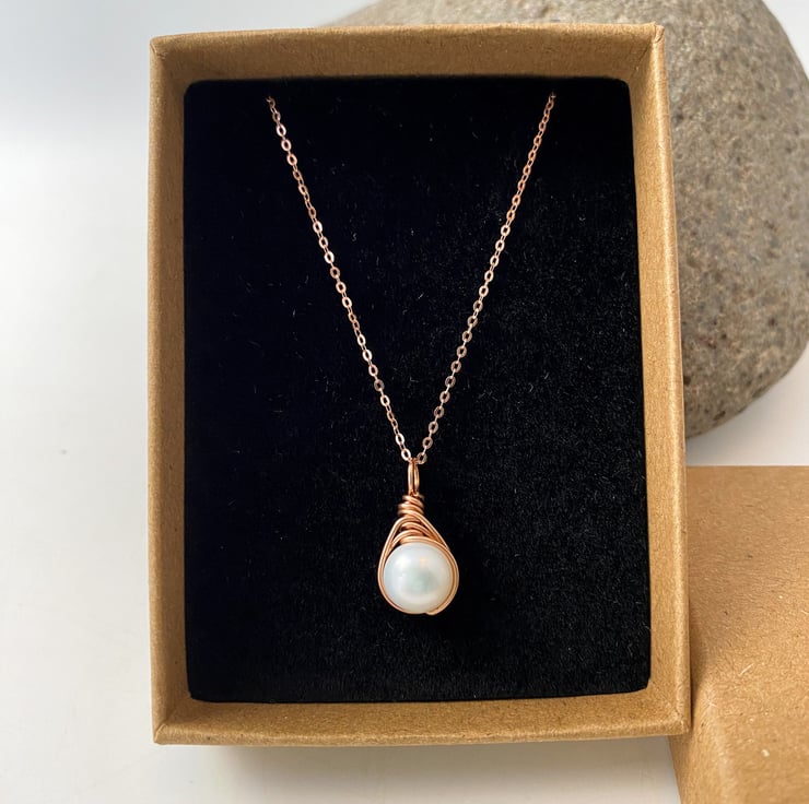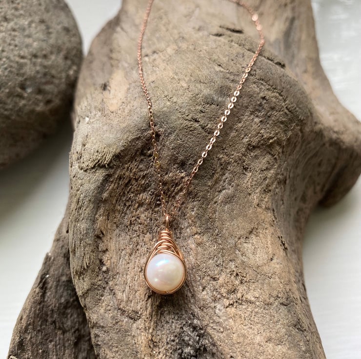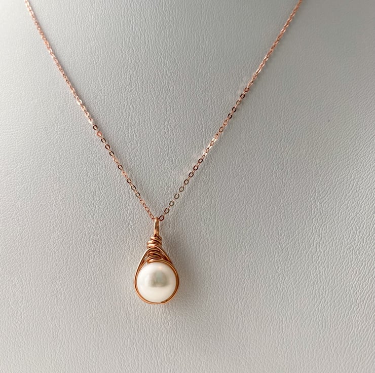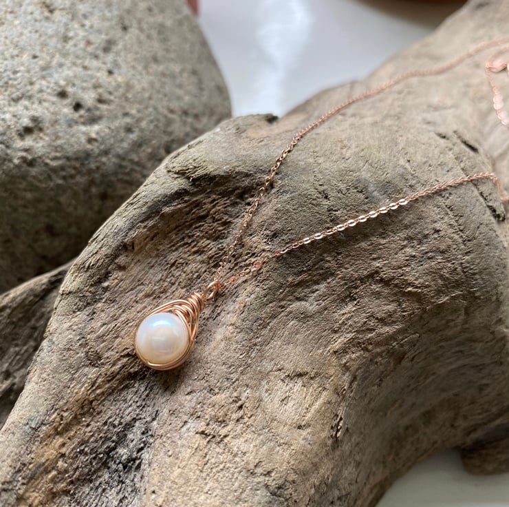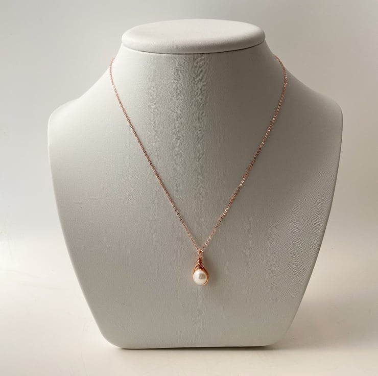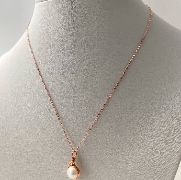 Beautiful Freshwater Pearl Drop Necklace. Rose Gold wire wraps around a beautiful genuine A grade Freshwater Pearl. Natural ivory white round pearls. The understated rose gold trace chain perfects the look of this elegant necklace. This necklace perfects both casual and smart attire. Pearl is the birthstone for June.