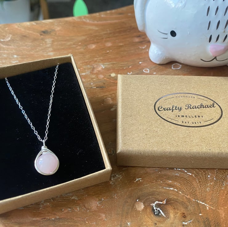 Rose Quartz and Sterling Silver wire wrapped drop necklace. Sterling silver wire wraps around a beautiful genuine Rose Quartz bead. Striking natural pink colour. The understated sterling silver chain perfects the look of this elegant necklace. The necklace compliments both casual and smart attire.