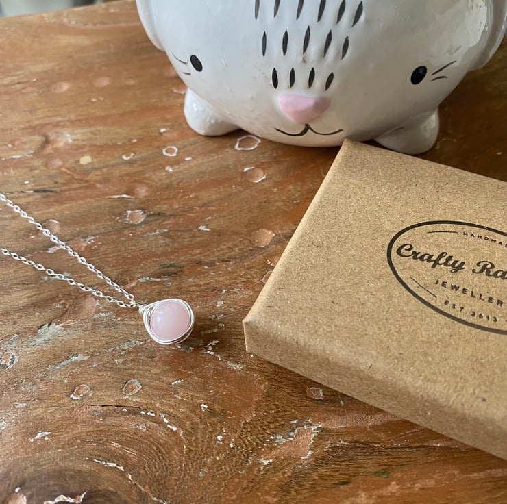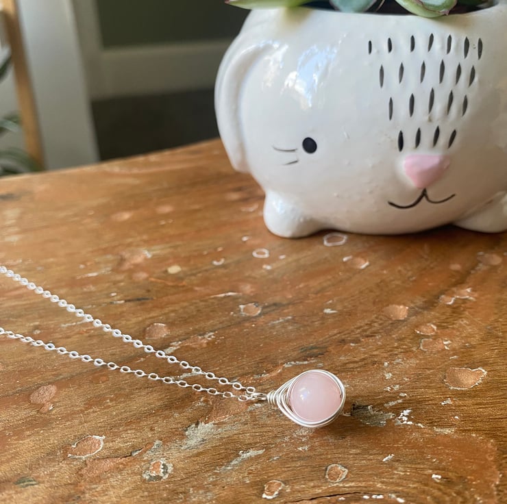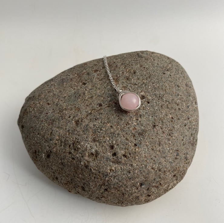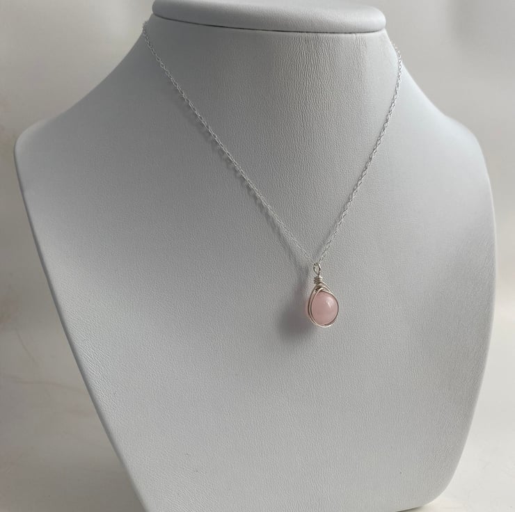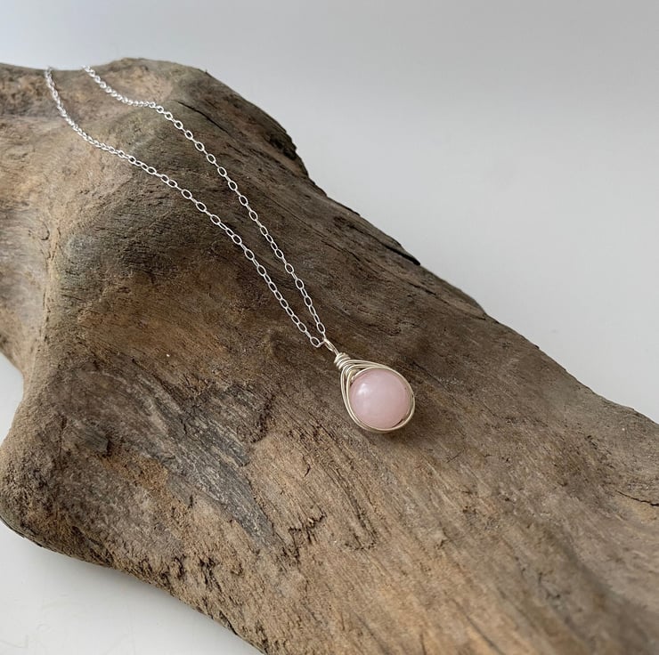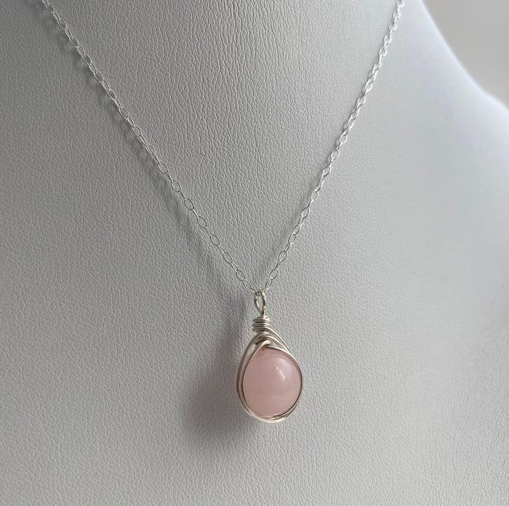 Rose Quartz and Sterling Silver wire wrapped drop necklace. Sterling silver wire wraps around a beautiful genuine Rose Quartz bead. Striking natural pink colour. The understated sterling silver chain perfects the look of this elegant necklace. The necklace compliments both casual and smart attire.