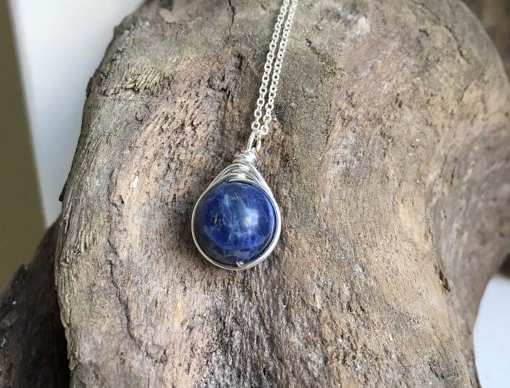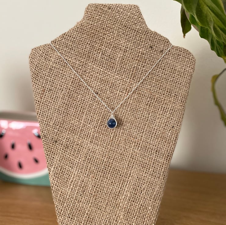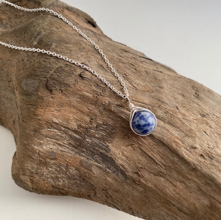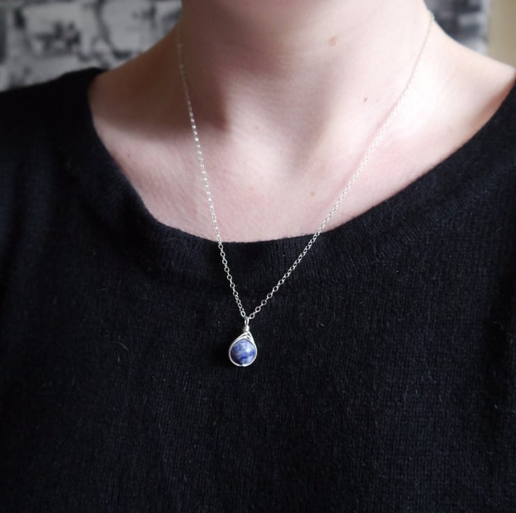 Beautiful Sodalite Drop Necklace. Sterling silver wire wraps around a beautiful natural Sodalite bead. Striking natural colour. The understated sterling silver trace chain perfects the look of this elegant necklace. Choice of 16, 18 or 20 inch chain. This necklace perfects both casual and smart attire. Sodalite is one of the birthstones for December.