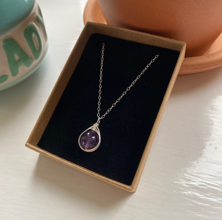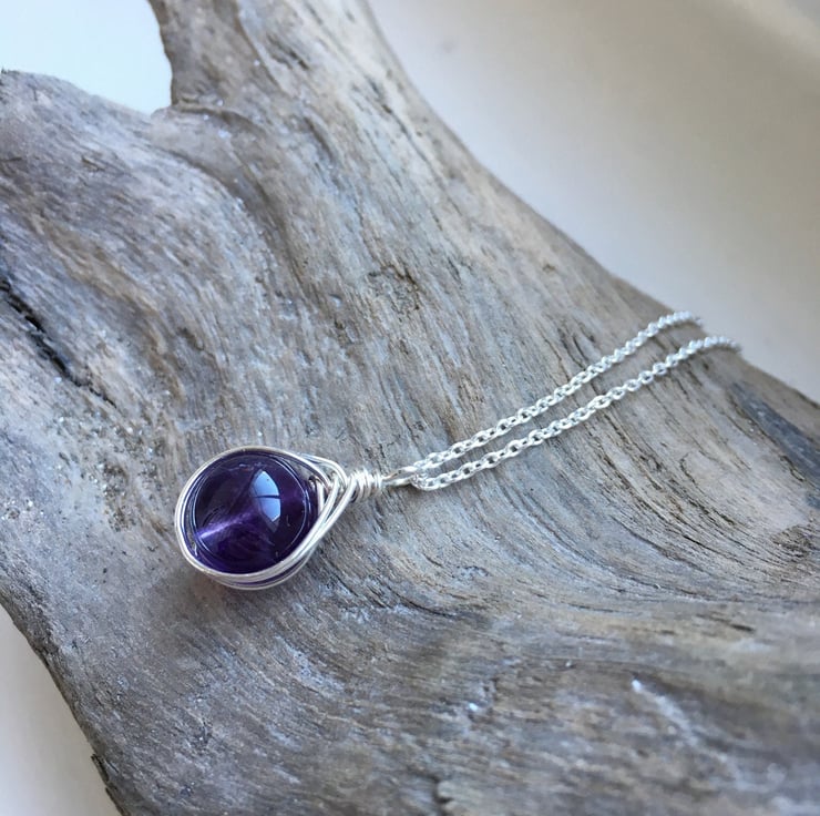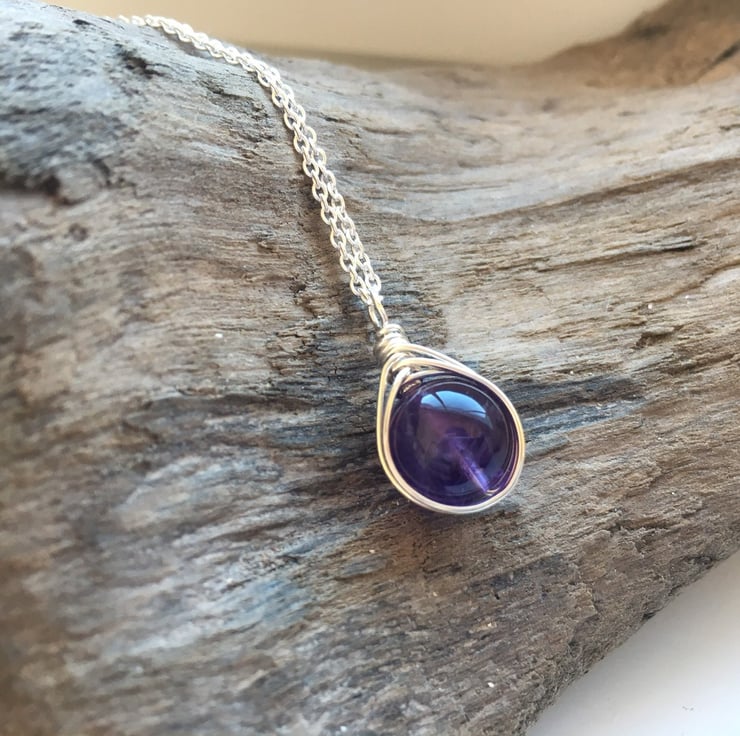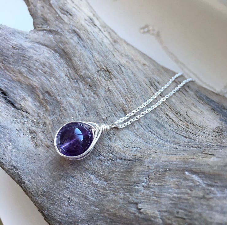 Amethyst and Sterling Silver wire wrapped drop necklace. Sterling silver wire wraps around beautiful genuine A grade amethyst beads. Striking natural purple colour.