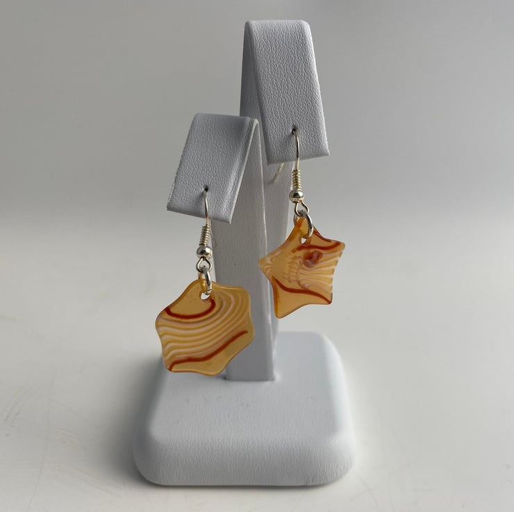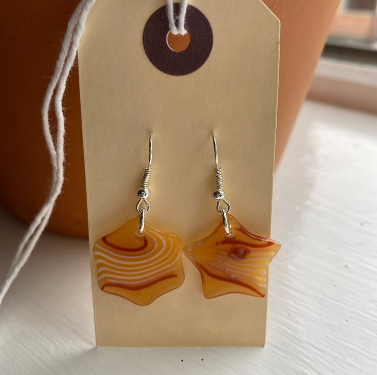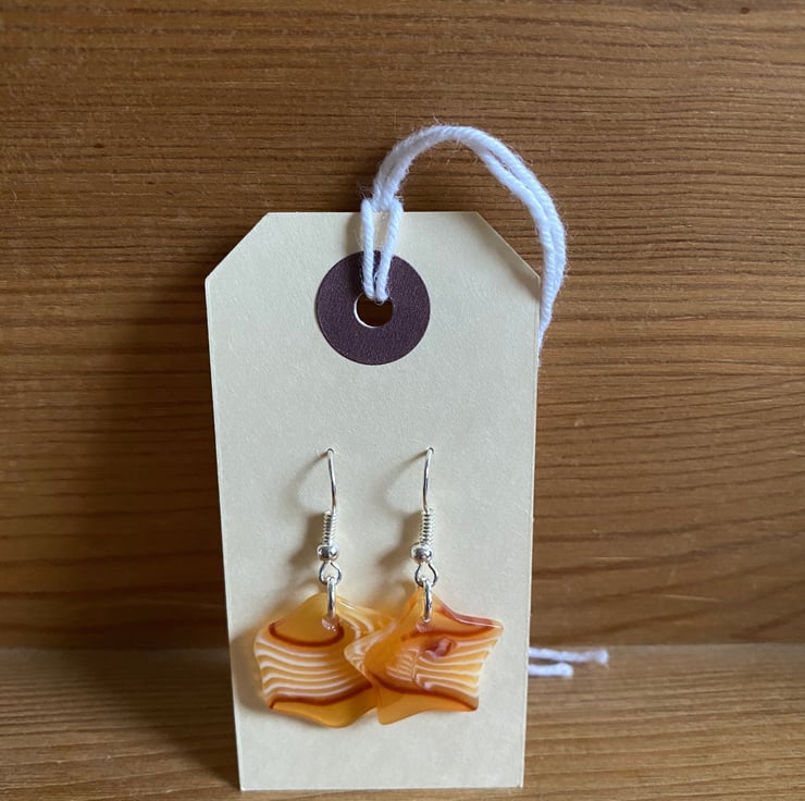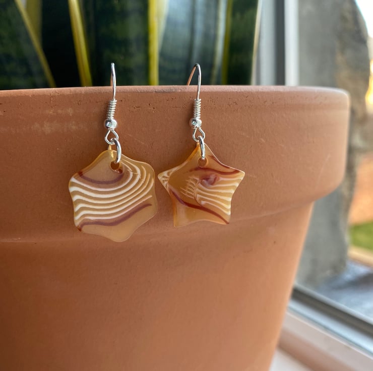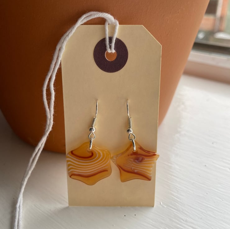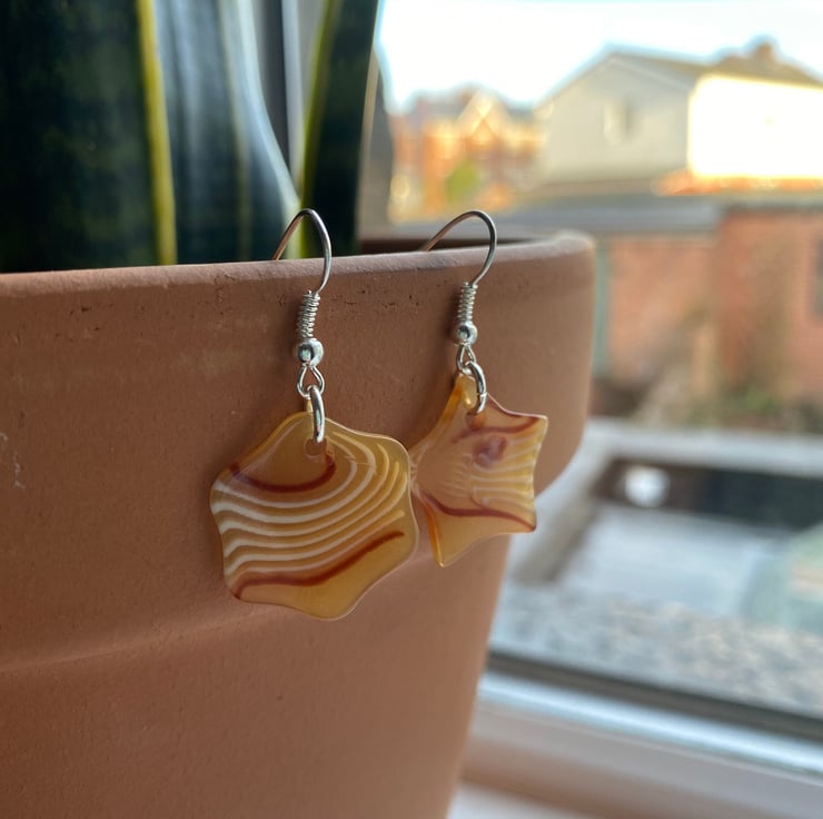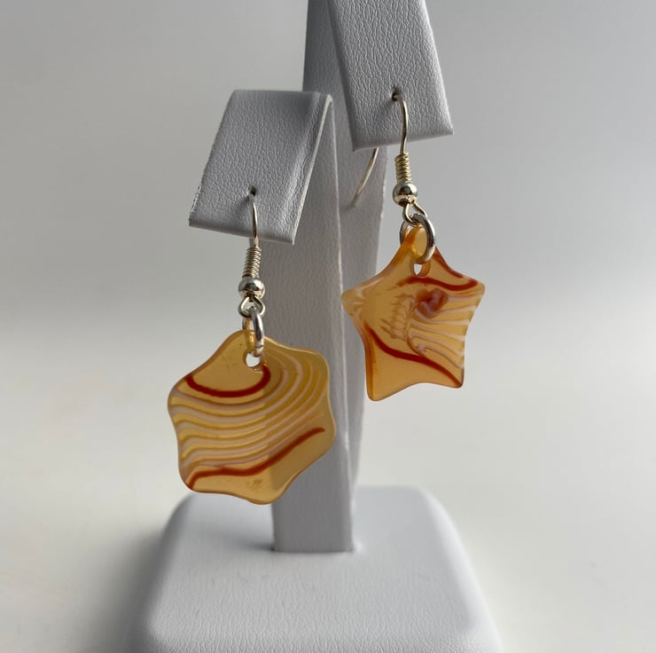 Striking vintage plastic star shaped shaped earrings with your choice of finish; silver plated or sterling silver ear wires (hooks). These earrings are unique, and only one pair is available of each design. These earrings have the same colour themes but they are slightly different star shapes. They are yellow, red and white in colour. The plastic shapes date from the 1960s 1970s.
