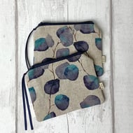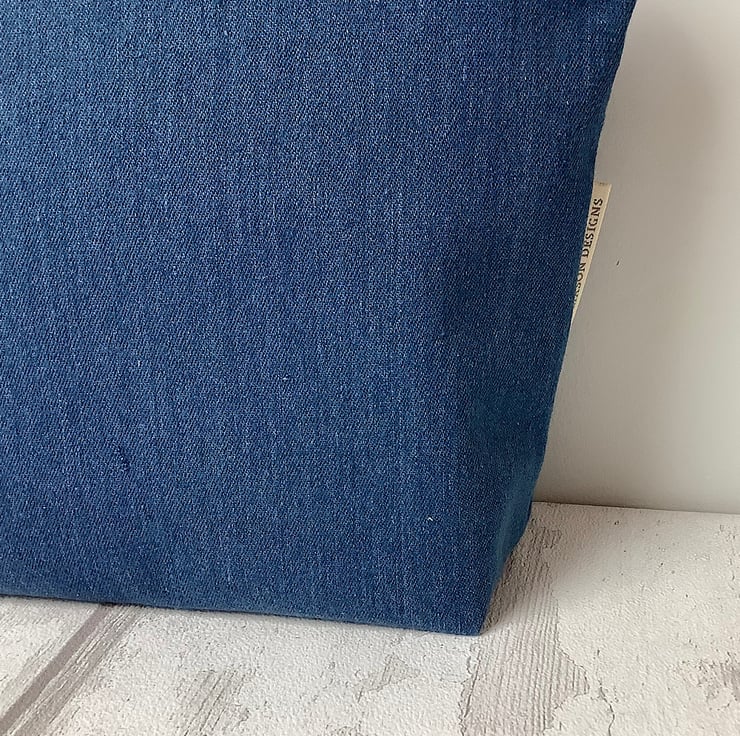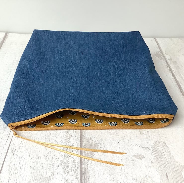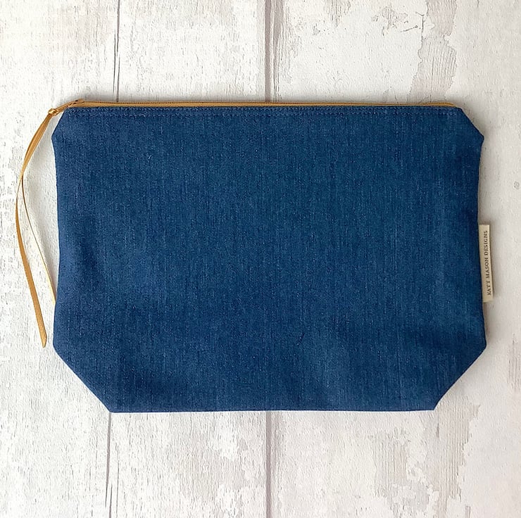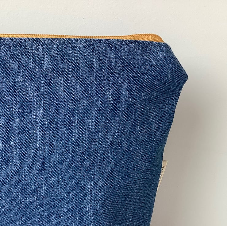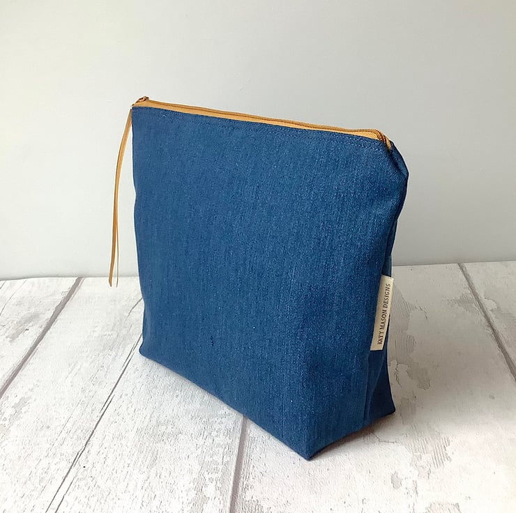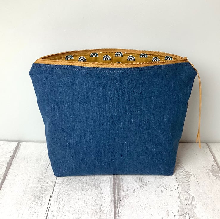 Pretty mid blue denim cosmetic or toiletry bag with a modern mustard print lining and zip opening. 26cm wide at top, 19cm wide at bottom, 8cm deep at base. Perfect for everyday or travelling. Handmade and matching tote or smaller purse available to match.