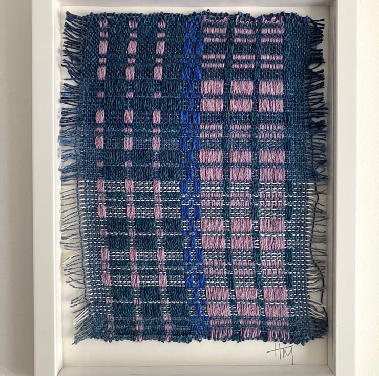 The handwoven panel is float mounted with hidden hand-stitching and displayed in a custom-made white frame. Un-glazed. A hanging cord is attached on the back.