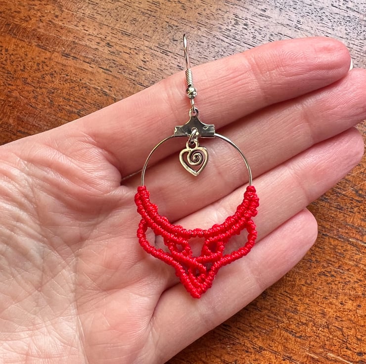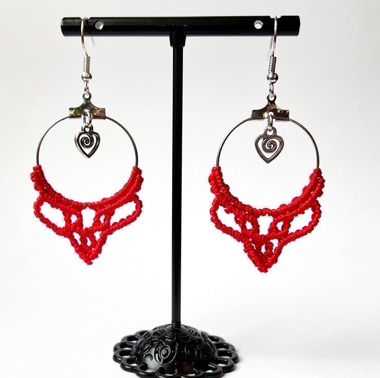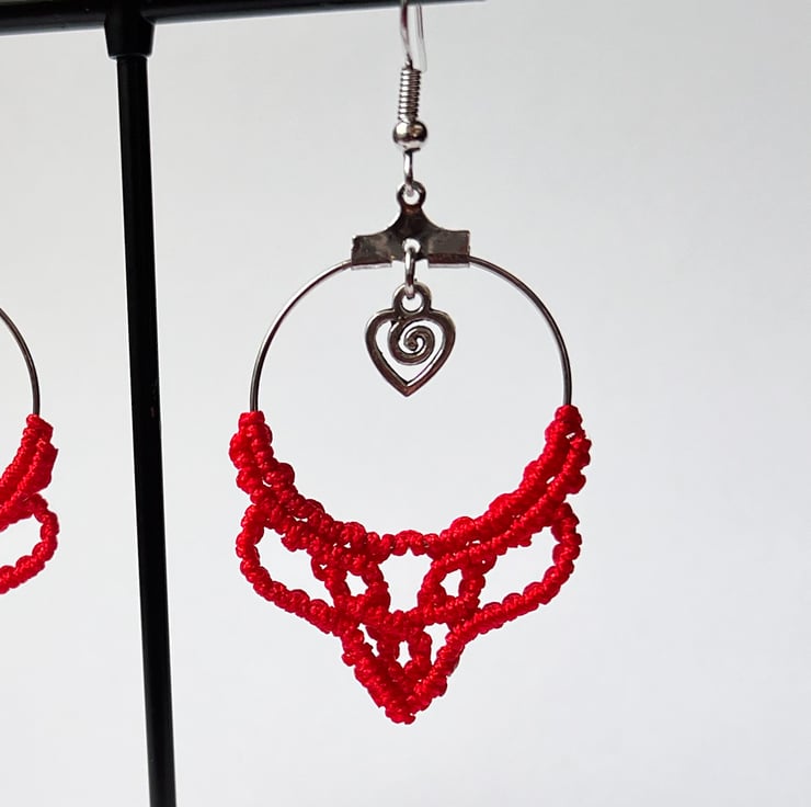 Macrame design is made by nylon thread attached and knotted onto silver coloured hoops, embellished with small heart.