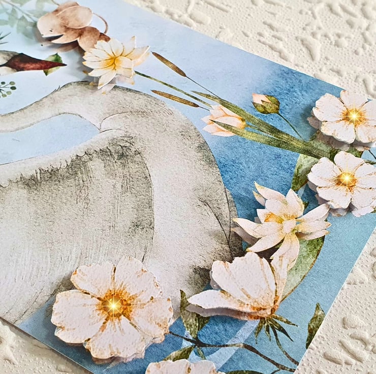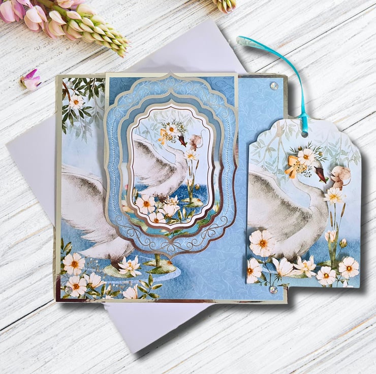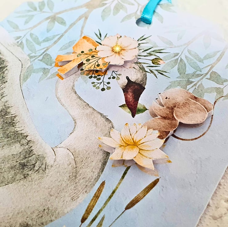 The gift tag features the same design as the card, decorated with raised, decoupaged flowers and craft gems. It measures 8.5 x 12.5 cm & is attached on ribbon.