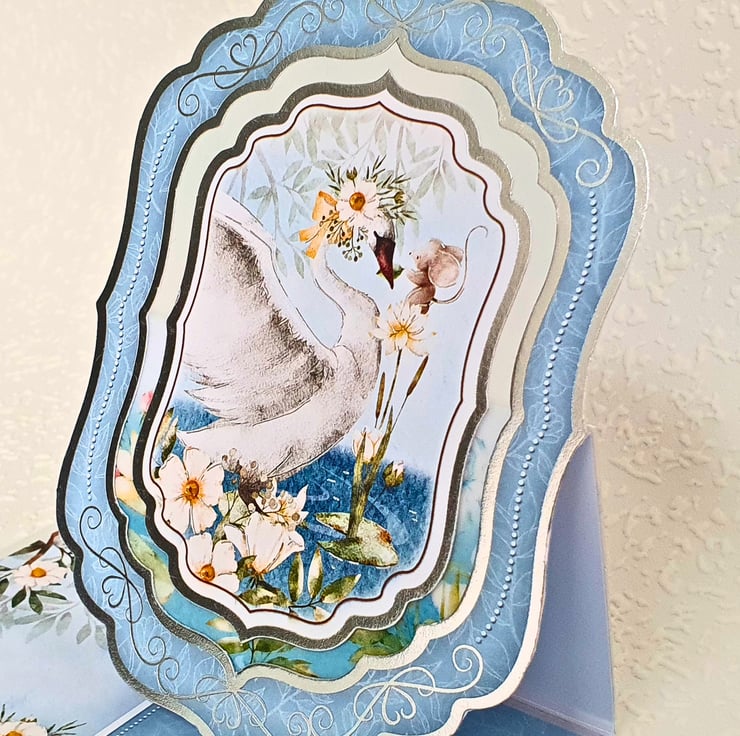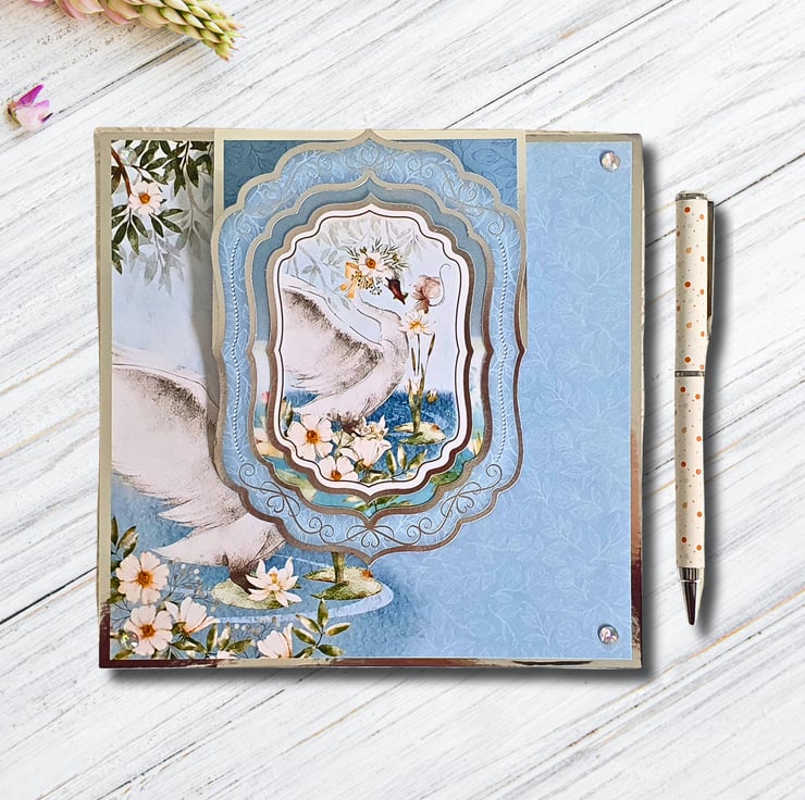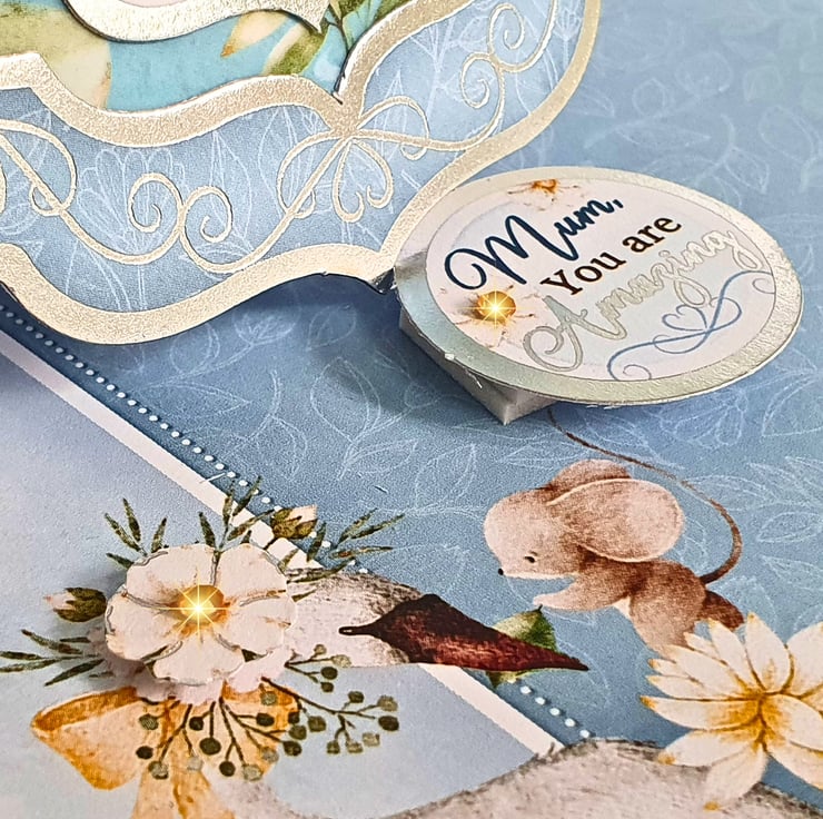 The card consists of mats & layers of silver mirror card, patterned cardstock & vellum, on a white card base. It is decorated with coordinating silver foiled toppers & the sentiment "Mum, You Are Amazing". It is embellished with matching craft gems on each corner, and the flower centres. To display the card, simply fold over the top framed panel and rest it on the raised tag. It folds flat to fit in an envelope. There is a matching insert at the back of the card, where you can write your message & wishes, or use the front panel instead. It measures approximately 17.3 cm square (6" 7/8).