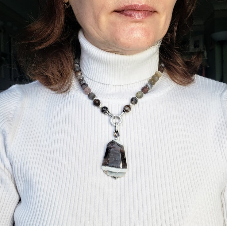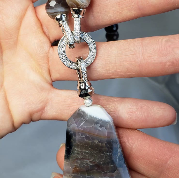 This necklace was complemented with zircon paved Rhodium plated snap closure and Agate charm.